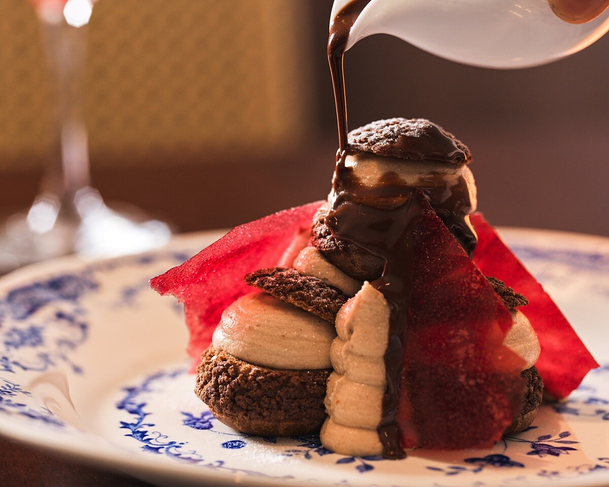 甜點部分,林庭右主廚選擇了最能代表法式甜點精神的經典之作,靈感源自傳奇人物奧古斯特・埃斯科菲於19世紀末創作的經典甜點美麗海倫燉西洋梨。Chef Leo 近一步說明:「這個甜點有一個很漂亮的名字叫做『Belle Hélène』,法國很多甜點都是用女性名字命名的,浪漫又優美。」以手工製成的四顆泡芙為主體,搭佐西洋梨雪酪,淋上法芙娜巧克力醬,呈現冷與熱、酥與滑的對比。( NT480)