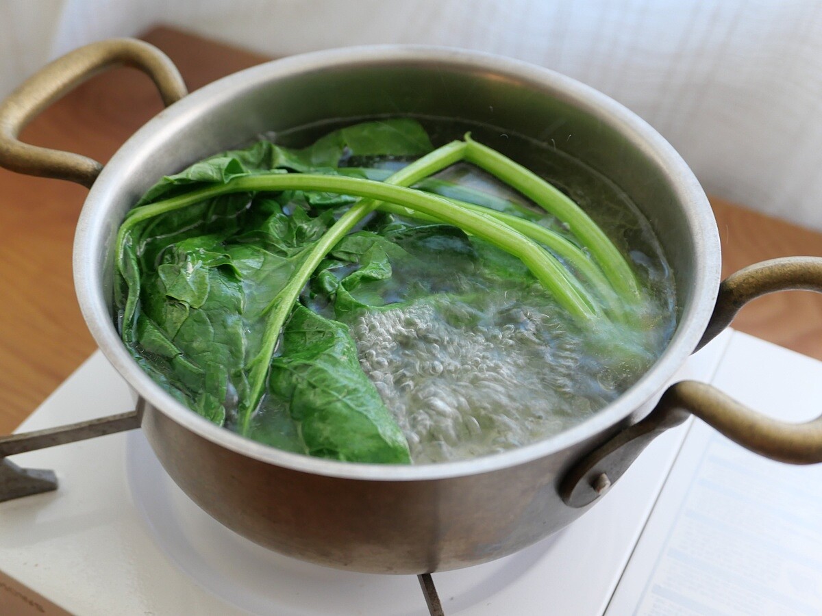 1. 取一大鍋加入一大匙鹽巴、一大匙橄欖油,水滾後把整株菠菜燙熟(約30秒),接著撈起來放涼。