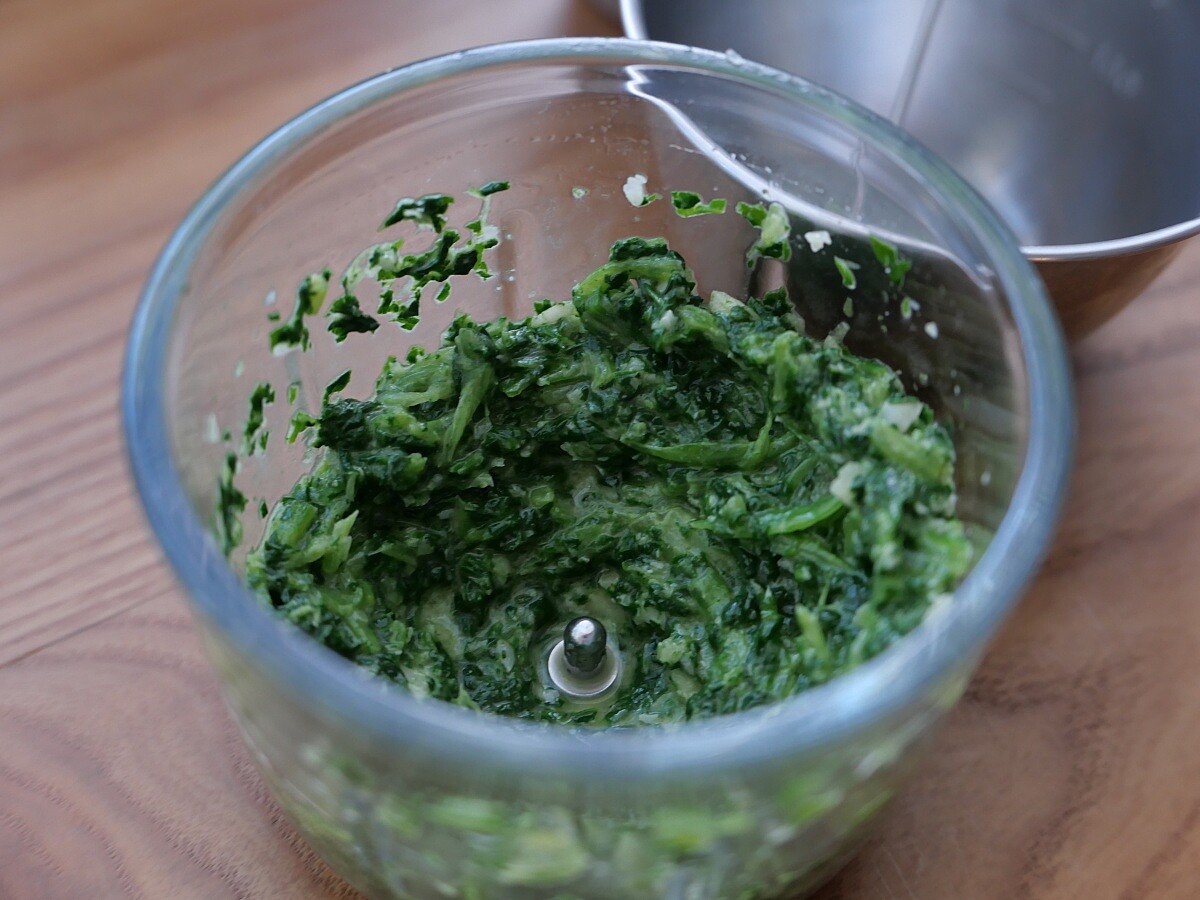 4. 菠菜、堅果、一瓣去皮的碎頭放進調理機中絞碎,加入一些橄欖油比較好打勻,打成泥狀即可取出備用。(也可用研磨缽慢慢磨碎)