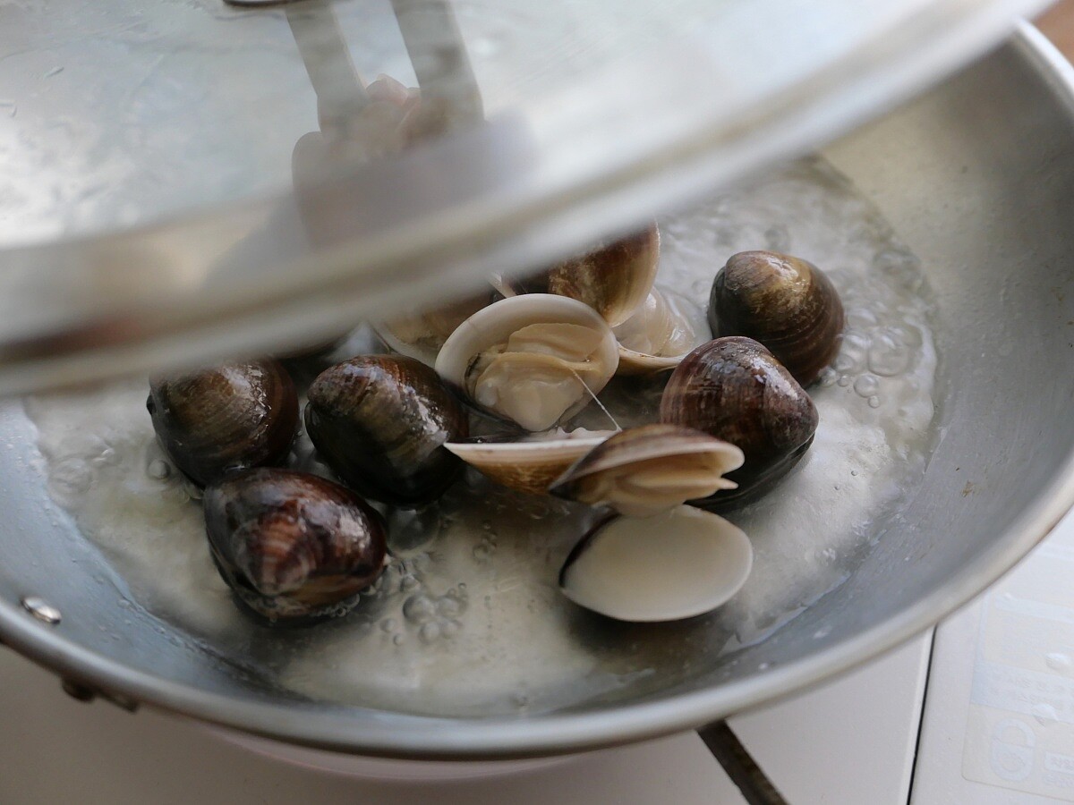2. 取平底鍋,加入蛤蠣、100CC的水,接著蓋鍋蓋待蛤蠣開後取出,並保留下湯汁另外盛裝起來。