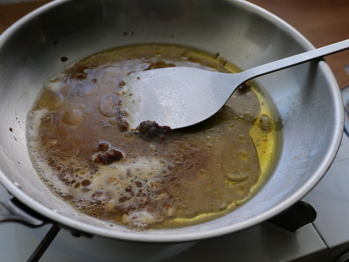 3. 平底鍋倒適量橄欖油、1瓣蒜末、大醬與苦椒醬,炒香,接著倒入蛤蠣湯汁,把醬料拌勻不要結塊。
