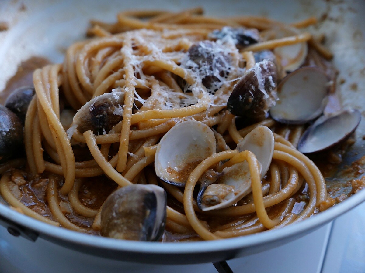 4. 倒入麵條、刨起司粉、加入蛤蠣一起拌勻,可試試看醬汁,若覺得太鹹可加入一點水、糖,抑或是加入鮮奶油調整成自己喜歡的味道。