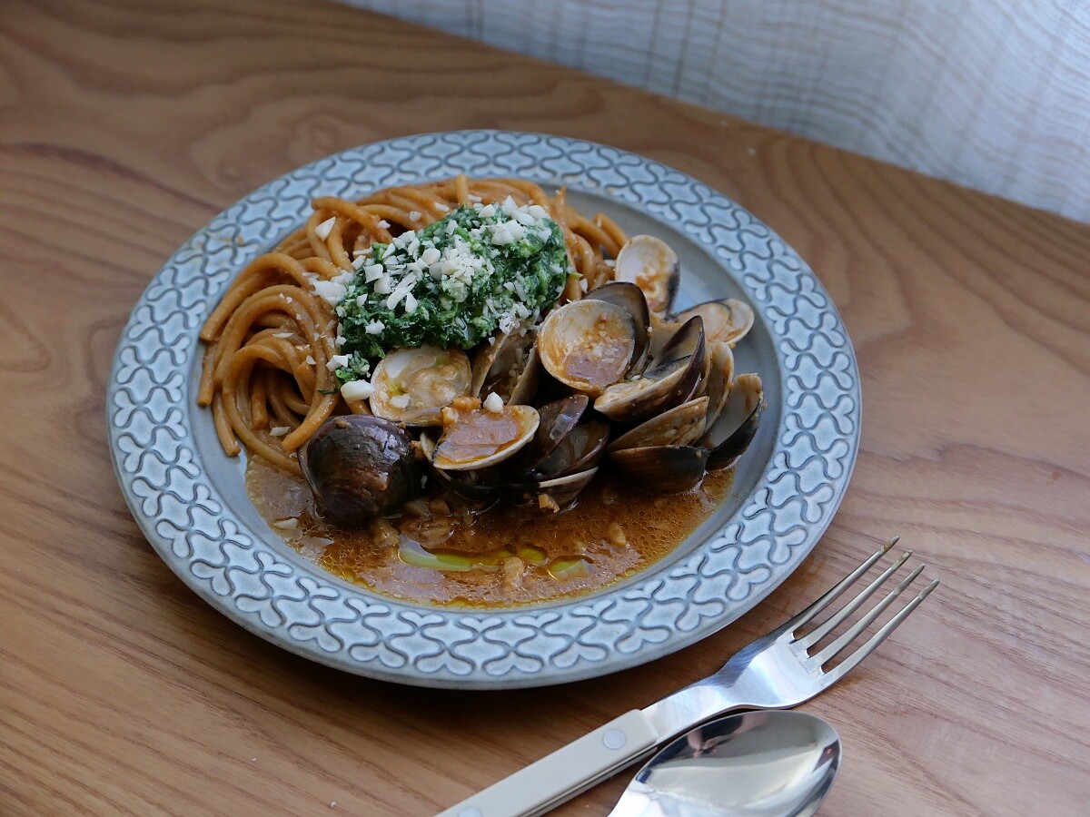 原來,延志永用了蕎麥粉做麵條,再以菠菜、松子做成點綴的青醬,接著擷取蛤蠣湯汁的鮮味,再加入大醬、跟苦椒醬作為醬汁。「大醬」(韓文:된장,doenjang) 是韓國最具代表性的發酵調味料,由黃豆煮熟後發酵、壓榨,再留下的豆塊自然熟成而成。它的味道鹹香濃厚,帶著獨特的豆香與發酵氣息,從日常的大醬湯到燉菜、拌飯,也像日本的味噌般的地位。延志永把這些食材靈活地組合在一起,讓看似普通的麵多了新意。
