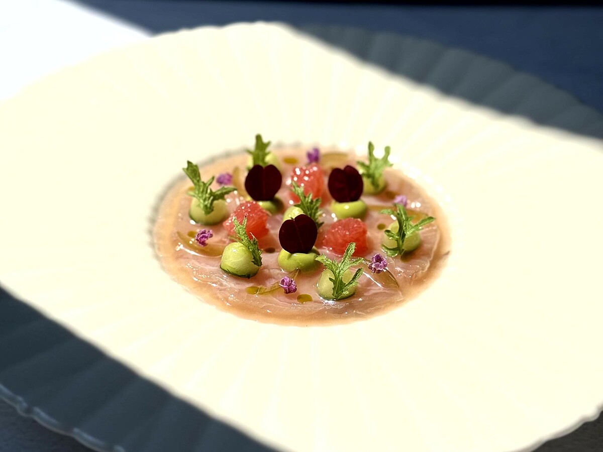 主廚以家鄉澎湖的夜色為靈感,將秋冬迴游的紅甘魚輕醃輕炙,搭配葡萄柚與茉莉花茶昆布醬,營造清爽酸韻,再結合酪梨醬、小黃瓜與寶來脆梅,平衡紅甘魚的豐腴,最後使用上紫蘇花與山葵葉當點綴,宛如月光在海面上粼粼閃耀。