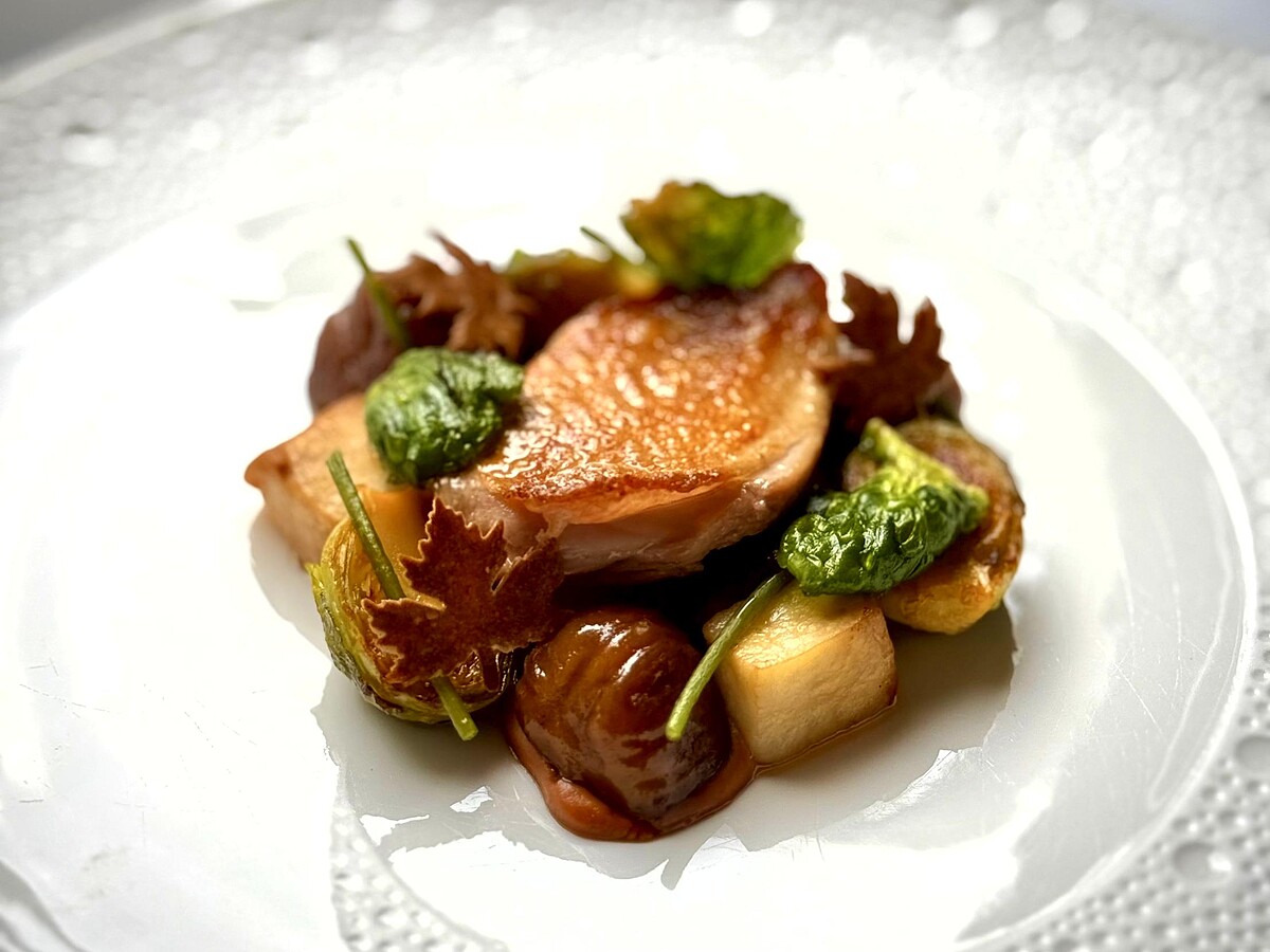 以六龜鵪鶉為主角,經陳年茶葉煙燻後散發木質溫潤氣息,配上牛肝菌肉汁與帕米加諾栗子泥,風味層次深厚。搭配舞菇、孢子甘藍、水蓮與栗子,點綴迷迭香油,讓盤面如同秋日林地,落葉與禽鳥的意象栩栩如生。