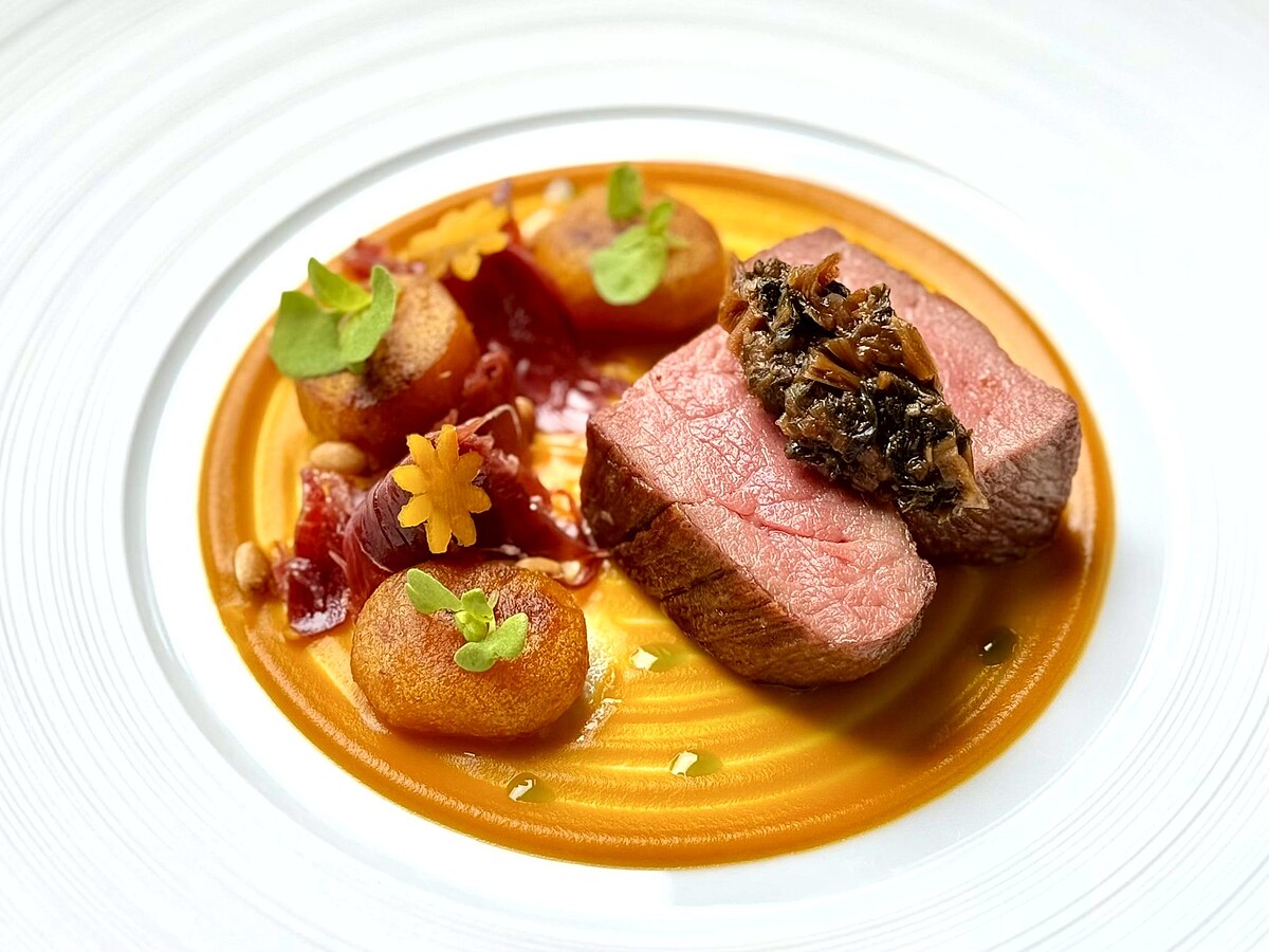 選用乾式熟成7天的橡子級伊比利豬肩,肉質柔軟、油脂香氣厚實。搭配南瓜赤味噌與客家梅干菜元素,鹹香與甘甜交錯,再以伊比利火腿、刺蔥與金棗蜜餞肉汁平衡厚重感,展現南國秋味的濃郁與層疊。