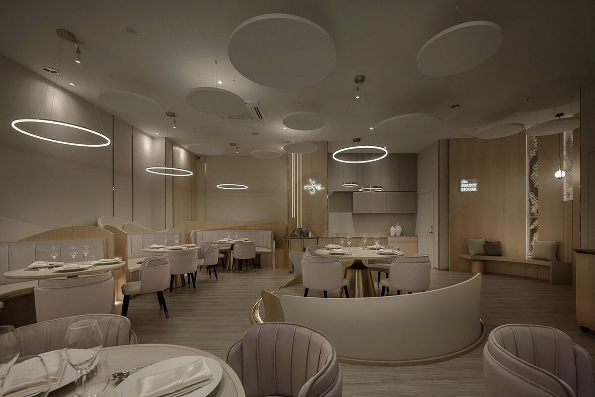 「方蒔 the FRONT HOUSE」除了能夠以料理感動人外,更在空間設計中融入海潮與島國之間的概念,運用竹材與蚵殼粉末打造牆面,展現永續精神。圓弧層疊呼應海浪意象搭配大地色與粉色家具,營造優雅卻不拘謹的氛圍。夫妻倆以「料理、款待」為核心理念,將外場與內場視為同等主角,用服務與互動讓每一次用餐都成為完整的體驗。