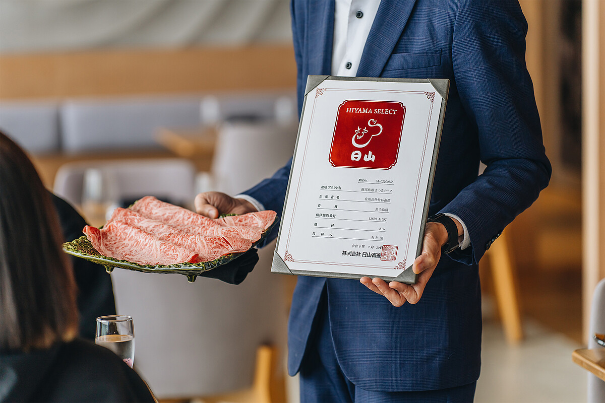 肉品在來到「壽喜燒割烹 日山」前,還需經過和牛鑑定師「全頭試食」,評估每個部位的赤身和脂肪比例、旨味釋放方式、脂肪融化的油香與品質,每款肉品的資料皆能在《日山筆記》中查詢。日山憑藉著無人能出其右的百年實力,榮獲 SQF 食品安全品質認證中最高等級,展現對肉品食材的最高敬意。今已傳承到第四代,社長村上宗郎不僅進行收購牧場計畫,以自家調配飼料育肥契作牛隻,更著手與學者共同鑽研,探究美味牛肉的完美脂肪比例。