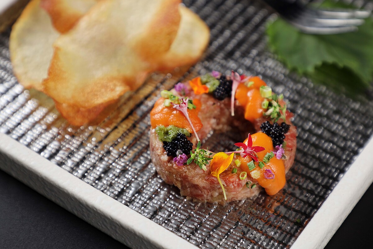 日山特選和牛切為丁狀與泥狀拌入信州味噌賦味,再透過炙燒讓油脂溶於肉質之間,點綴海膽增添鮮美層次。