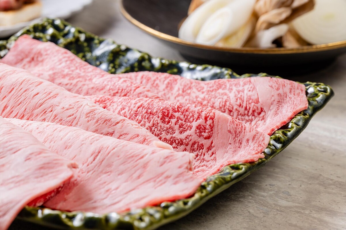 僅提供肋眼、沙朗、上肩肉共三大帶有油脂的部位呈現。開幕首波選以鹿兒島 A5等級薩摩牛,每片在55~60公克之間,厚度達2.5 mm,能完整品嚐到肉片吸附壽喜燒醬汁的飽滿滋味。