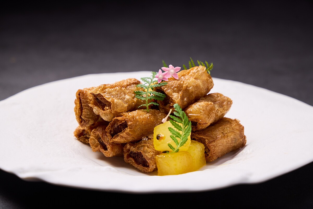 主廚李冠儀以紮實粵菜底蘊為根基注入異國料理的靈感,讓秋蟹的鮮味在每道料理中綻放不同風貌。前菜「蟹粉響鈴佐薄荷梅肉醬」以江浙經典炸響鈴包裹蟹粉內餡,搭配梅肉與薄荷調製的清爽酸甜醬汁,香酥與鮮香交織;「香惹鳳爪紅蟳煲」則是鳳爪蟹煲的升級版,選用鮮活紅蟳、黑雞鳳爪與叉燒、蕎頭、海鮮醬共煲,膠質與蟹膏交融,香氣撲鼻。和風「紫蘇白玉沙公」用日式高湯慢煨白蘿蔔,搭配紫蘇平衡蟹寒性,湯汁濃郁卻清新。另一道「金蒜雲呢拿沙公」最有驚喜感,主廚將香草冰淇淋與香草籽化為濃滑白醬,配以油封蒜頭與洋菇,香氣與甜味完美交疊,創造秋蟹的新味層次。