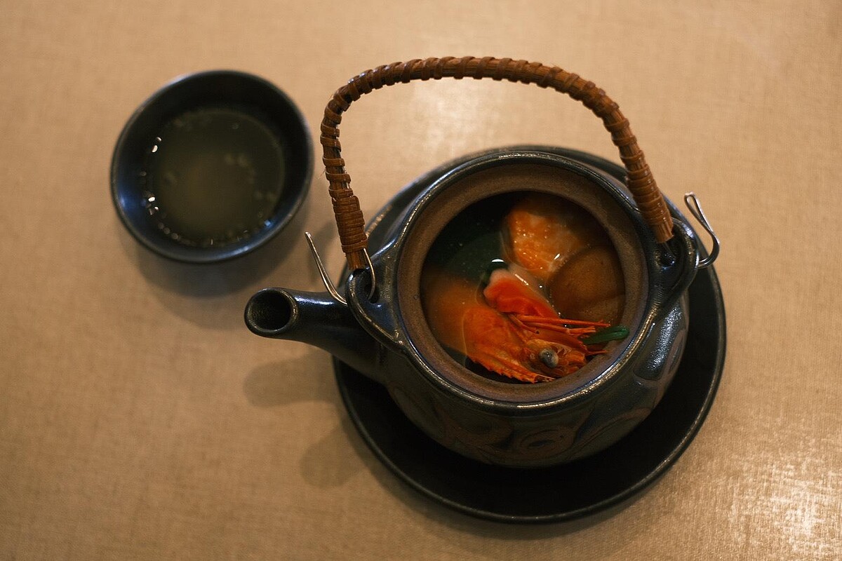 這份「秋之旬味會席套餐」像是以味覺譜成的一首秋曲,層層堆疊,節奏分明。開場的「秋期前菜盛」就如秋夜序章,以有馬山椒炙燒牡蠣的濃厚香氣揭幕,銀杏的淡雅、海鱺魚柚庵燒的微焦與紅酒漬番茄的酸甜,在一盤中交錯成一場小型季節展演;接著的「海鮮土瓶蒸」宛如秋日暖香的核心,以豚骨、柴魚與昆布熬煮6小時的白湯為底,蛤蜊、鮮蝦與時令魚肉讓湯頭層次圓潤,溫潤的氣息在啜飲間緩緩展開,如同秋日午後的一縷日光;主廚每日嚴選的「當日精選生魚片」則是整份套餐的節奏轉折,冰涼、鮮明、潔淨,讓味蕾重新歸零,迎接接下來更濃郁的章節。