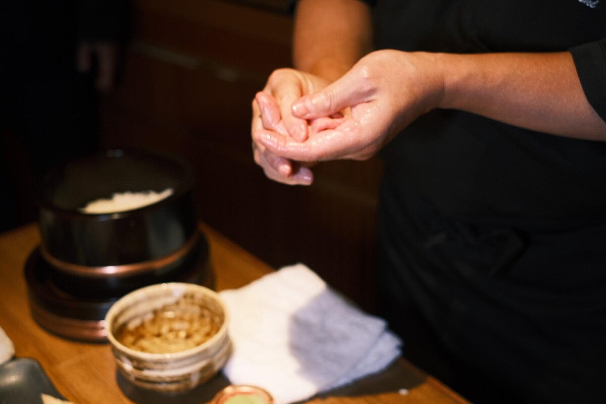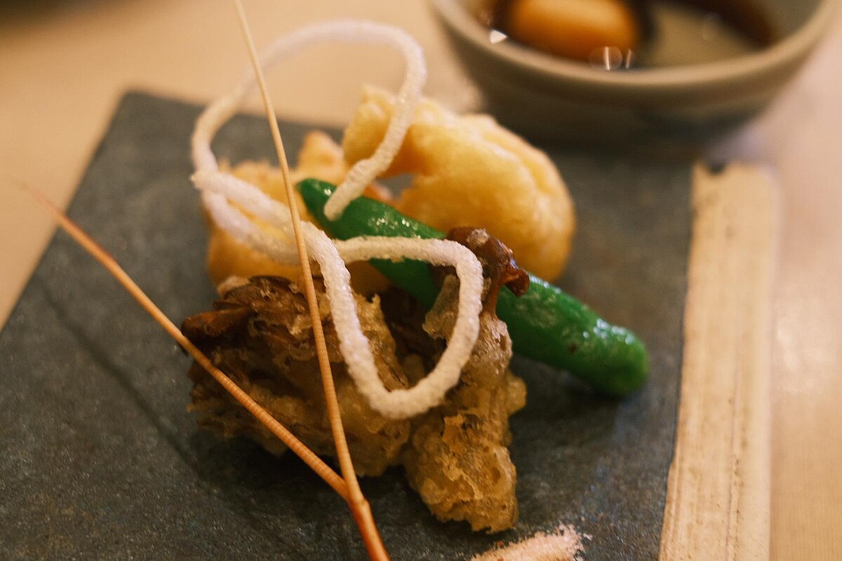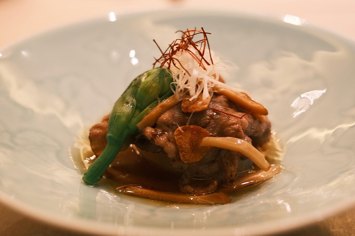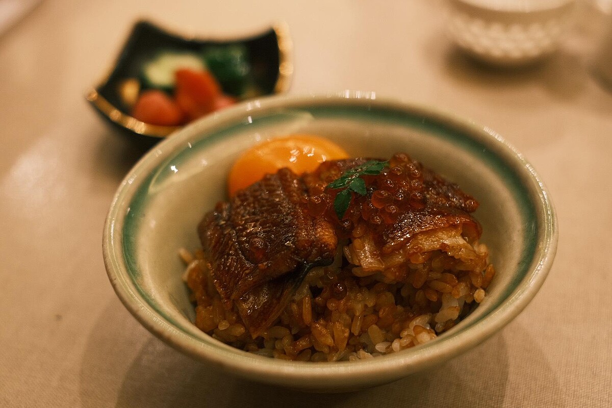 中段的料理像是主廚寫給秋天的一封信,既細膩又有重量。「和牛松茸旨煮」以炙火封香後慢煮收汁,讓松茸的木質氣息融入和牛油香中,肉質柔嫩、湯汁帶著溫潤厚度,搭配香酥蒜片,是整套會席中最靜謐的一段高潮;下一道菜色是「當日鮮魚與江戶前燉穴子握壽司」,以細火燉煮入味的星鰻與醋飯相融,重現江戶前的古典節奏;另一款鮮魚握壽司則以清爽收尾,展現食材本味。「龍蝦天婦羅」炸至外酥內嫩、金黃誘人,搭配舞菇天婦羅,香氣厚實如秋林落葉般豐盈;而「炙燒北海道干貝、海膽與京都湯葉」則以炙火收尾,最後淋上柚子胡椒芡汁,微辣中帶清香,為整場味覺旅程添上明亮的筆觸;「紅蟹甲羅盛」則以紅蟳蟹肉拌合秋葵與鮭魚卵的清新收尾,讓濃與淡在口中重回平衡。主食「鰻魚月見小丼」宛如秋夜的滿月,炭火炙燒的鰻魚香氣瀰漫,搭配半熟蛋液與月光米的光澤,米香、蛋香、醬香交錯,柔和而充滿餘韻。