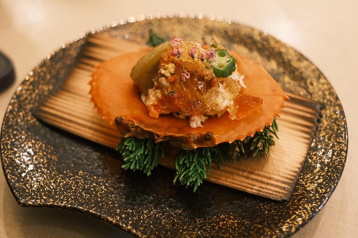 菊地良幸起初夢想成為棒球選手,卻因熱愛美食而踏入料理之路,出身東京的他從大阪料理學校畢業後,在東京全日空酒店展開職人生涯,從洗菜、炸檯、宴會料理一路歷練。他笑說自己曾為了練習擺盤連續3個月每天只專注於同一個動作。多年後他的足跡遍及亞洲多地,如今第一次來台灣,坦言只造訪過台北、基隆與淡水,但對台灣印象極好,「朋友都說台灣很好,人好、地好。」他特別提到第一次嘗試台灣的地瓜、龍蝦、貝類、鮑魚、紅蟳等在地食材,讓他感受到豐富的食材層次與創作靈感,「我希望能讓前菜更展現季節性,但同時也會努力引進更多日本食材,讓整體風味更接近會席精神。」