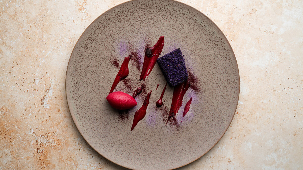 這次的「味の交會」餐會由白水主廚率領副主廚與兩位助手親自來台,以九州海洋記憶為主軸,與高雄風土展開料理對話。開場以台灣養殖鱘龍魚與魚子醬入題,從魚肉到魚卵呈現完整的生態鏈,緊接著以番茄的不同形態組構出明快層次。冷前菜「花椰菜的多重表情」以泥、漬、薄片三種技法演繹單一食材的多樣面貌,配上蘋果與甜菜根結合的紫色布丁腸作結,讓整體節奏柔和而克制。