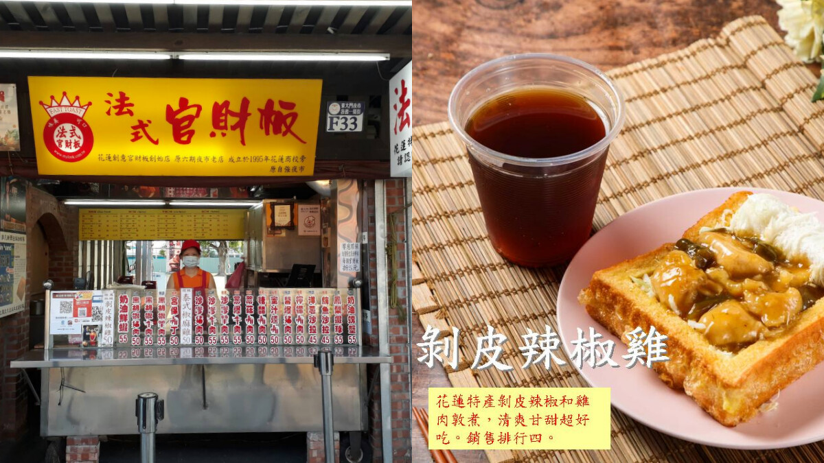 花蓮的「棺材板」和台南口味不同,採法式吐司做法讓人顛覆印象。厚片吐司裹蛋液後油炸成金黃外殼,再挖空填入濃郁內餡,是法式吐司混合台灣在地口味的創意組合。從黑胡椒牛肉、鮪魚沙拉、鳳梨蝦球到特色剝皮辣椒雞等,喜歡鹹口、甜口、辣口的各位都能找到最愛,每份還會附贈一杯古早味紅茶或奶茶超解膩。