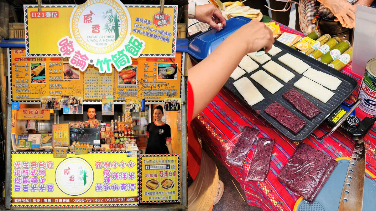 「原香嘟論竹筒飯」主打原住民味的老派手藝,有竹筒飯、現烤麻糬、馬告香腸、剝皮辣椒和各種口味的小米酒,集結各種花蓮特色。將糯米、香菇、豬肉丁與鹹香配料填入竹筒中,以阿嬤傳承的器具並按照古法蒸煮後,竹香及米香撲鼻,鹹香Q彈。現烤麻糬則不添加糯米粉,以100%純米製作,碳烤後軟綿迷人,大人小孩都會喜歡。