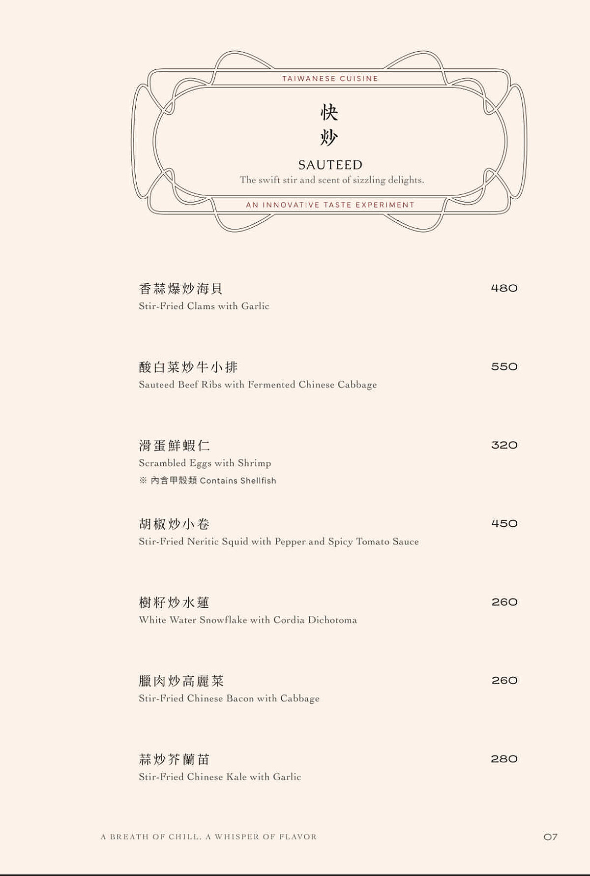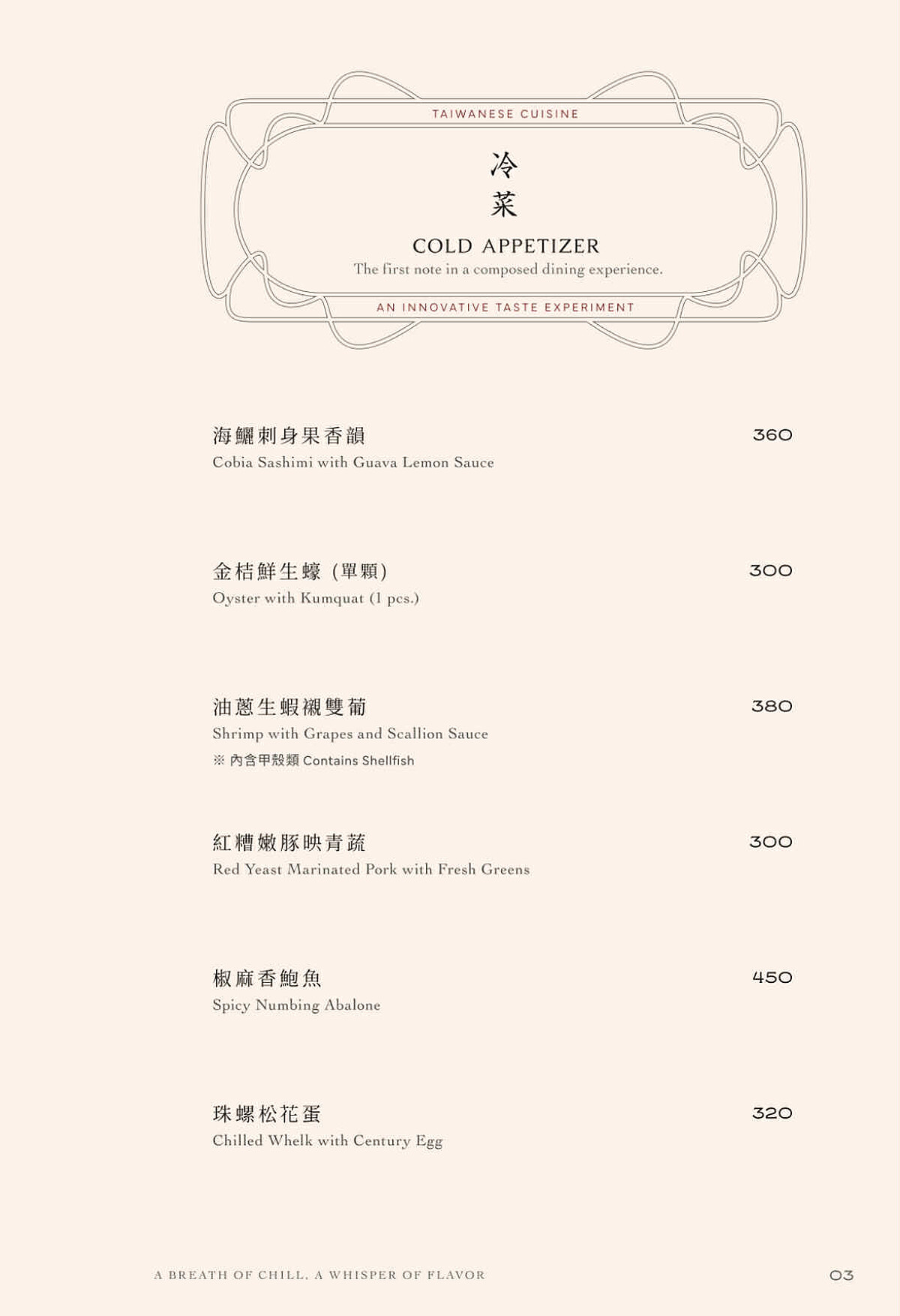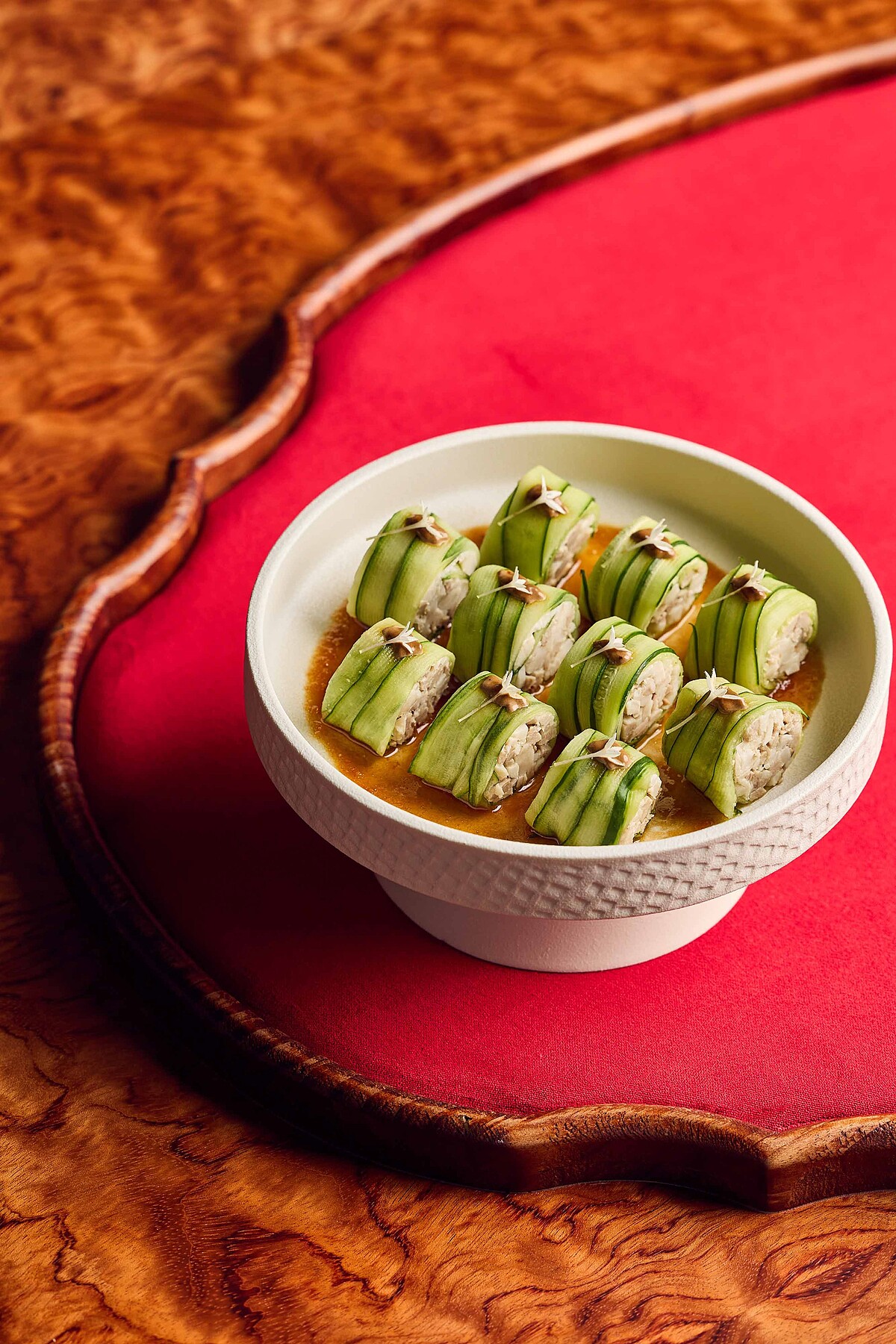 「蒜蓉玉豚卷」:從蒜泥白肉汲取靈感,肉品特別選用以無毒農產飼養為理念的台灣品牌,將五花肉細切後精巧裹上爽脆小黃瓜,淋上自製蒜蓉醬,讓傳統滋味於當代餐桌綻放新貌。