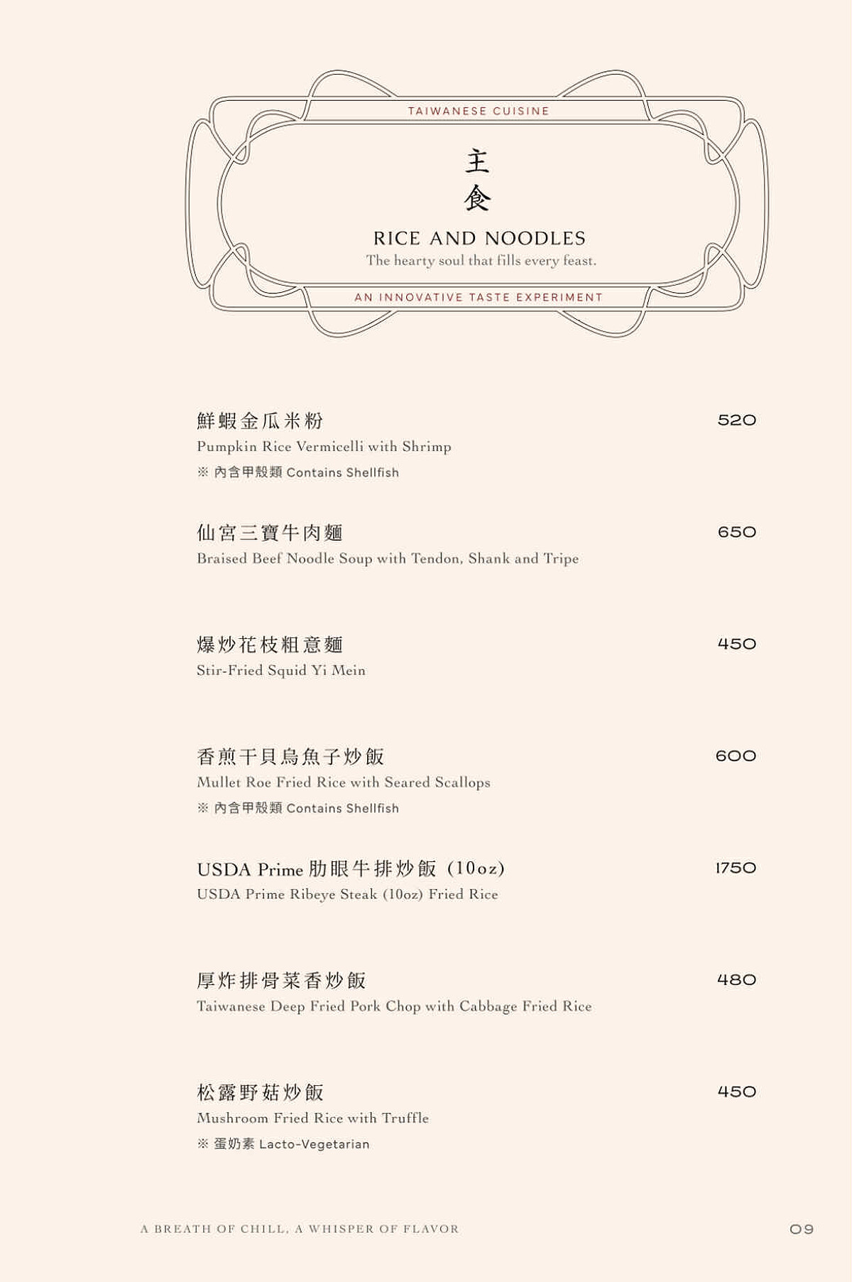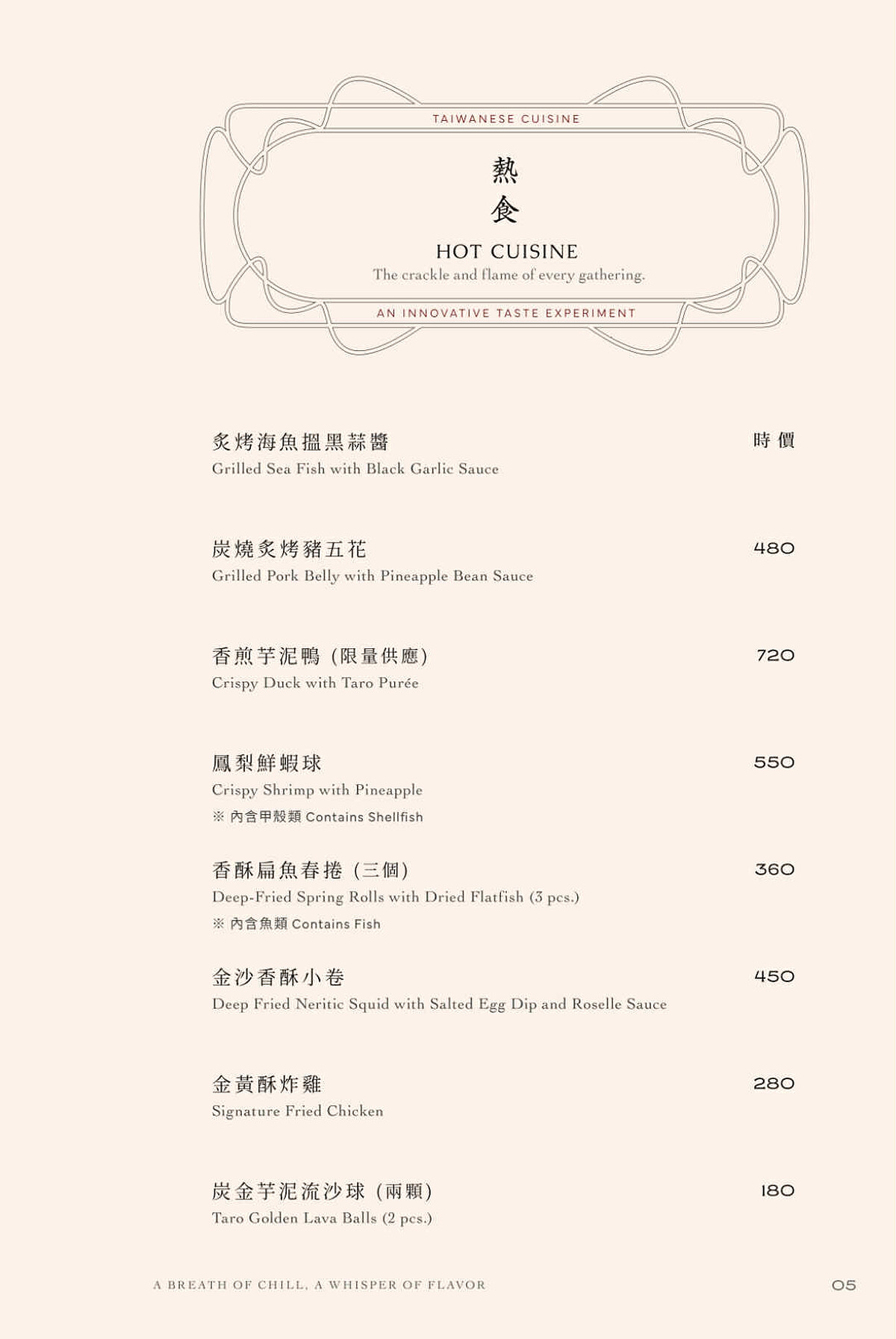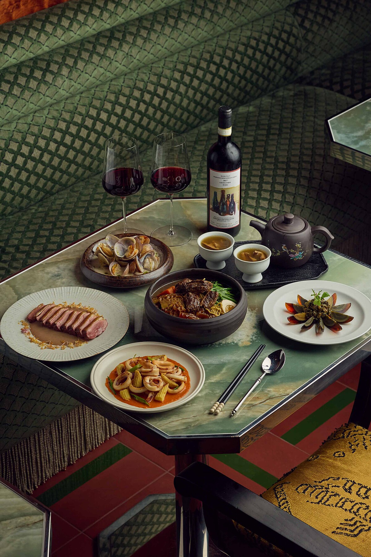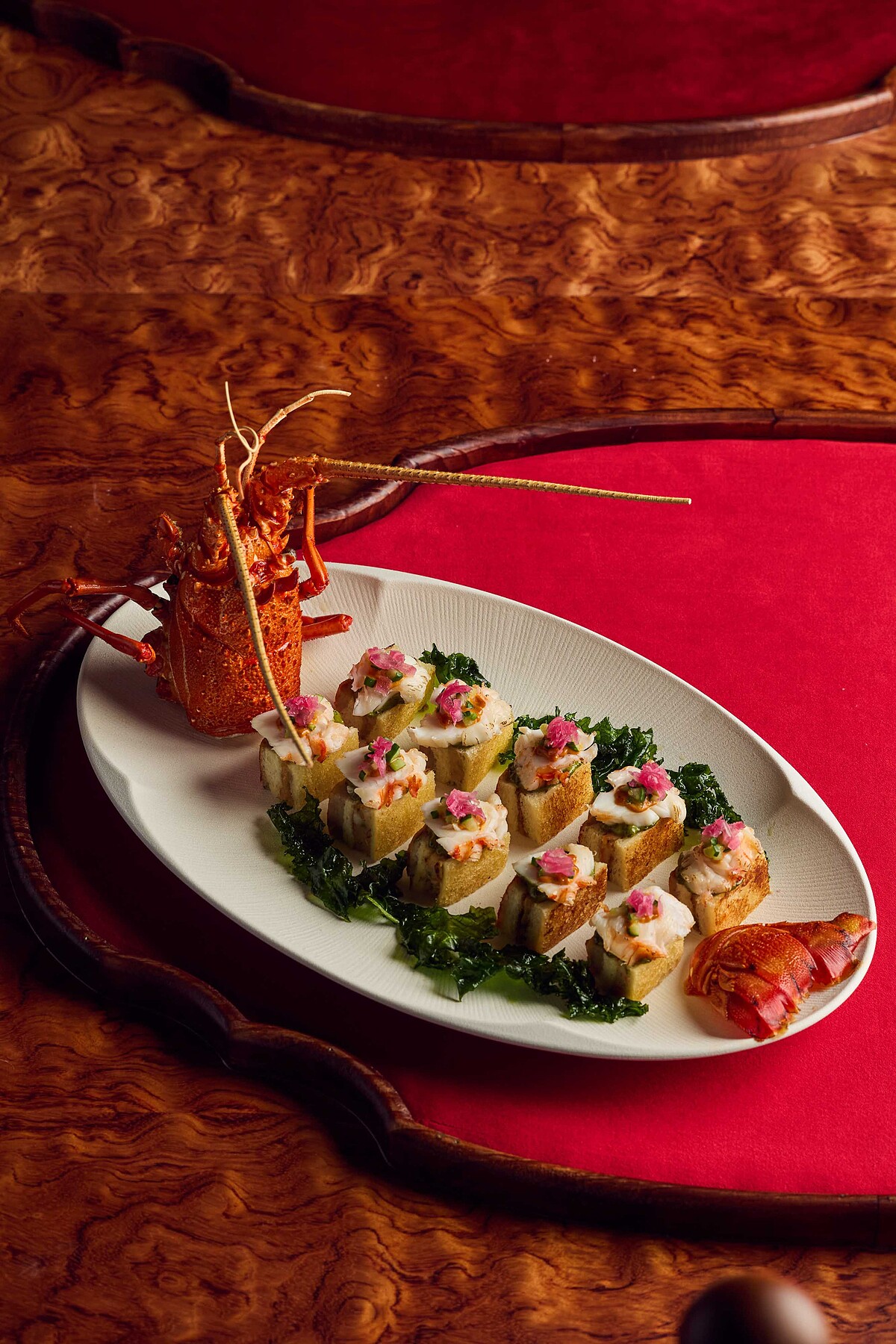 「龍蝦錦玉脆金磚」:承襲早期辦桌文化中「無龍蝦,不成宴」的氣派象徵,將經典龍蝦三明治轉化成更精緻的方形金磚。嚴選活體龍蝦,吐司內層鋪上手工花枝漿後酥炸,結合飽滿龍蝦肉,再佐以數小時熬煮而成的蝦膏及特製九層塔青醬,盡顯澎湃海味。