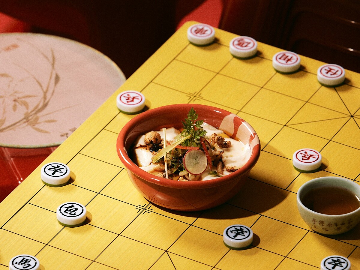 以四川鹹豆花作為創意起點,並改以精緻的涼拌手法呈現。軟嫩的豆花配上匯聚大紅袍、朝天椒、乾辣椒、花椒等多種辛香料、耗時費工製成的獨門辣油,還有鹹酥花生、榨菜、爆薏仁花、山蘿蔔葉等佐料,整體香氣逼人且帶有立體的鮮明層次,乃是店內的明星品項。