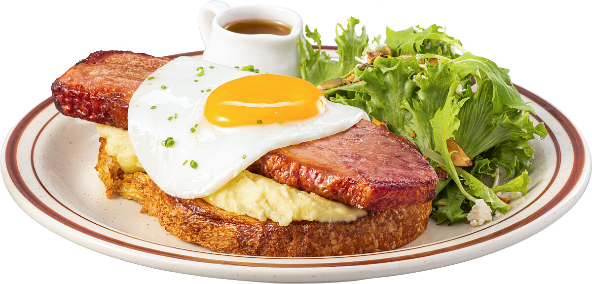 朝氣滿滿的太陽蛋,抹上蜂蜜的鹹甜厚培根搭上綿密薯泥,油脂與香氣滲入外酥內軟酸種麵包,每一口都是無法抗拒的罪惡饗宴!(科大店限定)