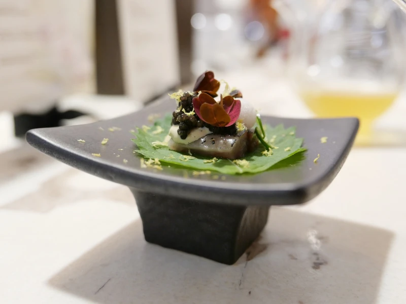 在南洋地區常以檳榔葉(荖葉)包裹入菜,餐廳這次選用用造型很像的紫蘇葉取代,讓整體口感更輕盈。裡面包著來自北海道的秋刀魚,搭配剝皮辣椒醬汁和蘿蔔泥,最後撒上檸檬皮絲。並選擇產地為伊朗的魚子醬,這款魚子醬的特色是採用低鹽處理法,所以吃起來更能強調魚子的原味與鮮味,帶有細緻奶油風味,為肥美的秋刀魚帶來醇厚的尾韻。