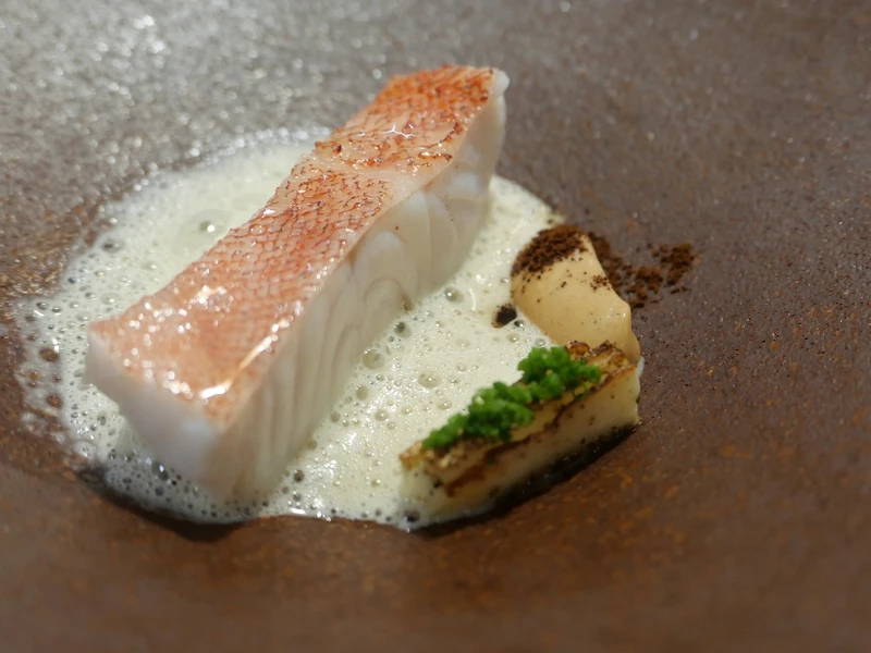 選用紅條作為主要食材,左側白色泡泡中加入了甘邑白蘭地,靈感源自 Chef Ernest 家中在過年或節慶時以 XO 煮魚頭湯的習慣,為傳統增添細膩香氣。 右側乳白色醬汁上灑有咖啡粉,底層以魚露與焦化鮮奶油調製而成。不同於一般使用奶油的作法,改以鮮奶油進行焦化,使風味更柔和,並帶出自然的奶香與甜潤感。 配菜選用綠竹筍,搭配蝦夷蔥與青花椒增添香氣,整體層次清爽平衡。建議趁熱享用,能充分感受到魚肉的細緻與醬汁的和諧。