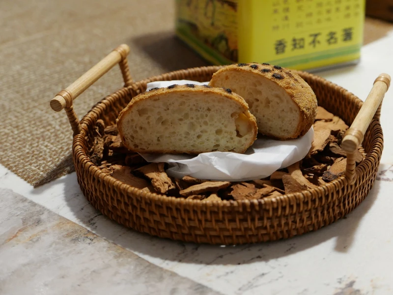 「斑蘭葉絲捲」,可視為南洋風格的可麗餅,餅皮以中式技法製作,融合斑蘭葉與蕎麥,帶出清新的草本香氣與柔韌口感。內餡使用風乾木瓜,加入南薑增添辛香,並以夏威夷果與香草葉絲豐富層次。食用時可先解開外層斑蘭葉,再品味內餡的香氣變化與口感對比。