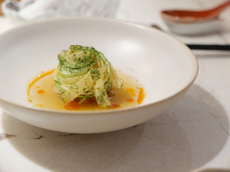 以馬來西亞的亞參叻沙(Asam Laksa)為靈感,結合台灣常見的涼麵,成為一道低澱粉、酸香清爽的秋季主食。傳統叻沙會以椰奶為基底,而亞參叻沙則不含椰奶,改以番茄、羅望子、香茅與南薑熬煮,風味酸、甜、辣並重,魚香鮮明。 麵體以新鮮豆皮與結瓜取代傳統麵條,搭配台灣醃蝦與菠蘿蜜,營造出熱帶果香與海鮮香氣交融的層次。附上的高湯以自製叻沙醬炒製後澄清,加入番茄汁、香茅、檸檬葉與香料,湯色清透卻香氣濃郁。享用時可感受到夏季薑、薄荷、刺香菜與萬壽菊交織的清香。