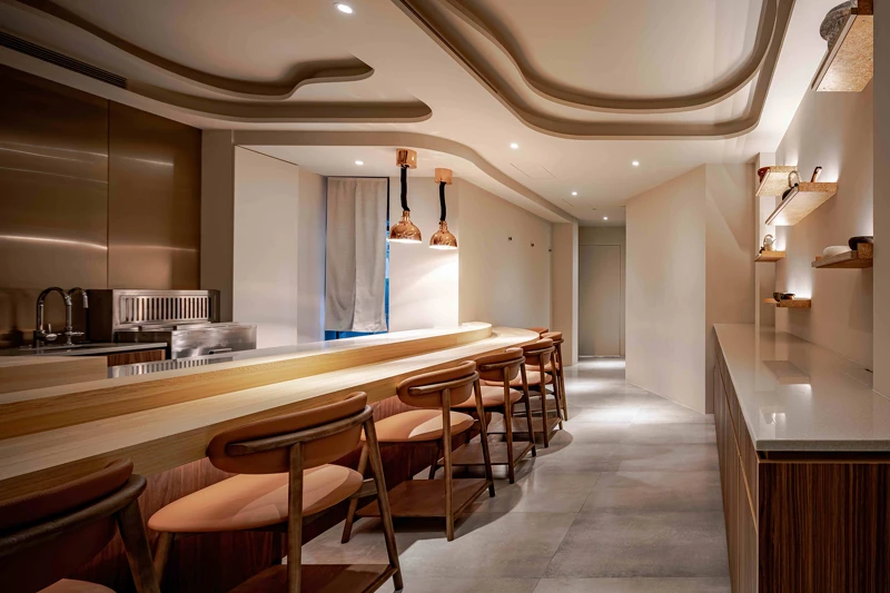 「すし謙」整體空間由設計師游雅清打造,榮獲IAA「French Design Awards法國設計獎」金獎肯定。設計靈感取自主廚鍾謦謙的烹飪哲學「謙遜與精準」,以刀的象徵與日本傳統伊勢形紙雕刻技術融入空間。純白極簡線條取代傳統木格結構,牆面與天花的半月形切片象徵料理的層次與節奏。小編坐在吧台前時,注意到空間沒有一絲多餘裝飾,能夠讓人特別專注在面前的美食,彷彿整場用餐是場安靜的儀式,只需專心聽廚刀落下與茶湯流動的聲音。