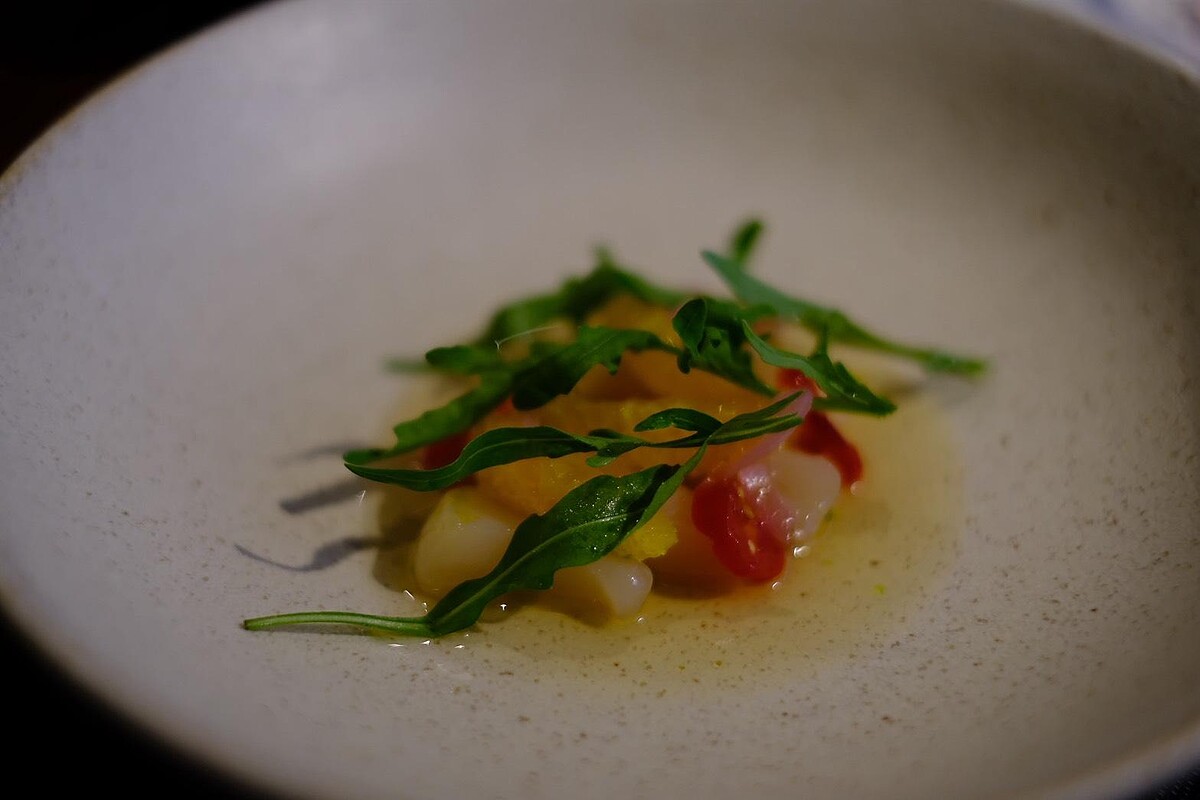 以辦桌前菜「五福拼盤」的概念開場。秋冬正逢柑橘盛產,主廚將干貝與新鮮柑橘結合檸檬葉清香,酸香明亮,開啟味蕾的序幕。