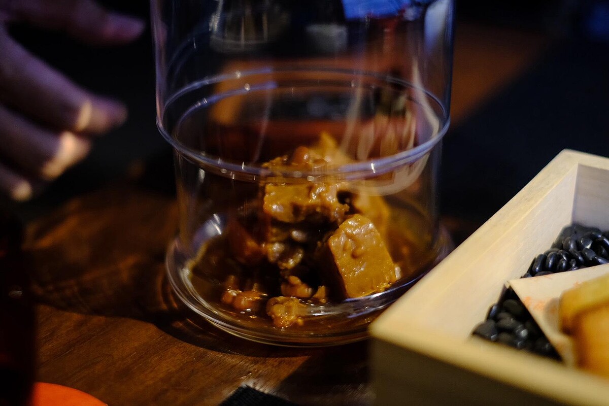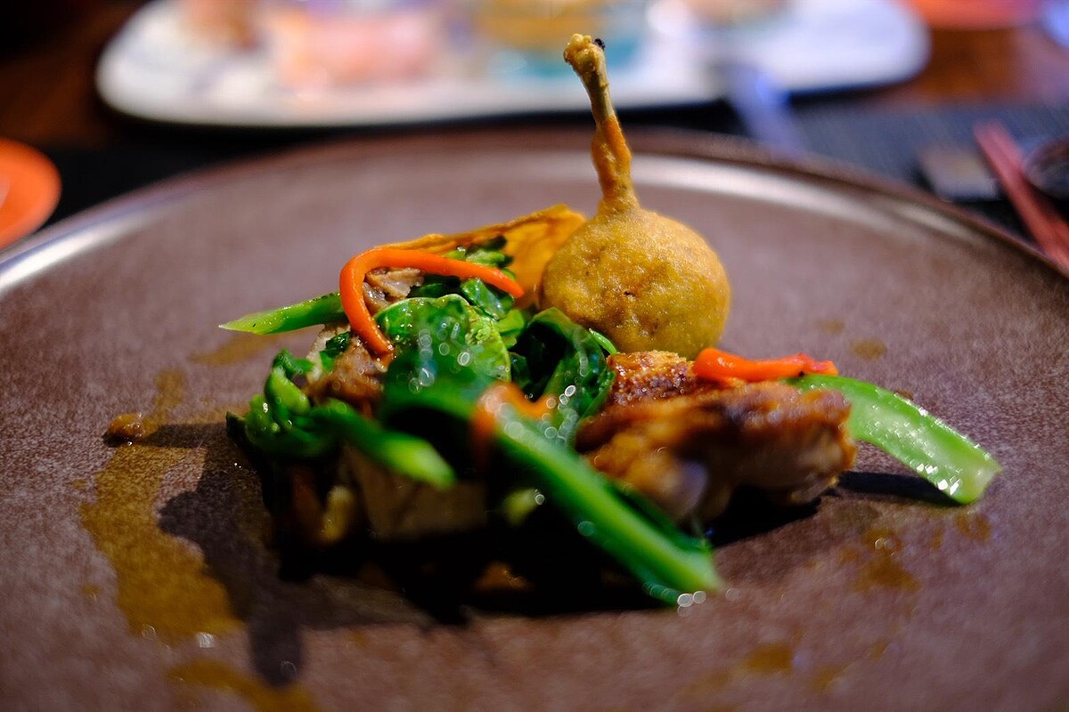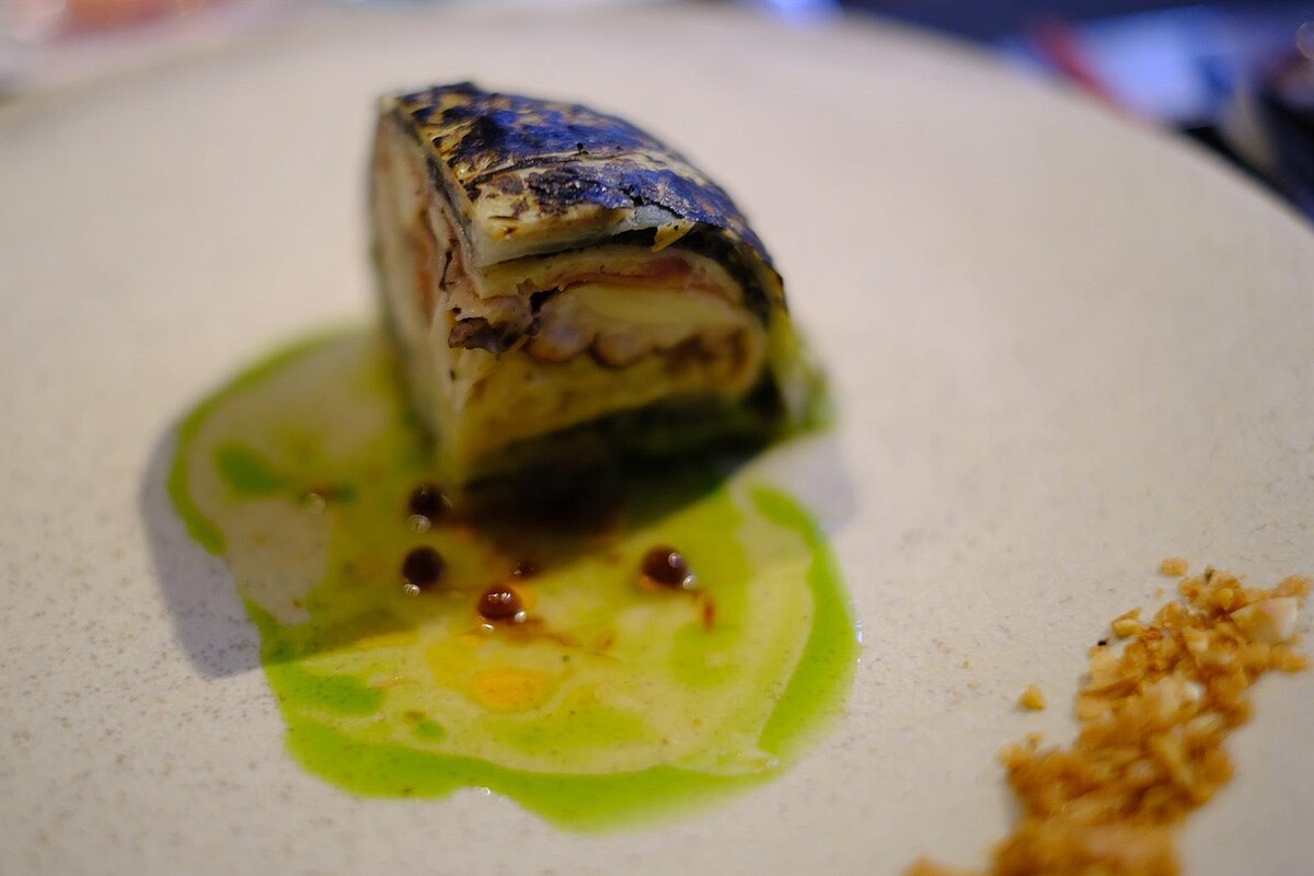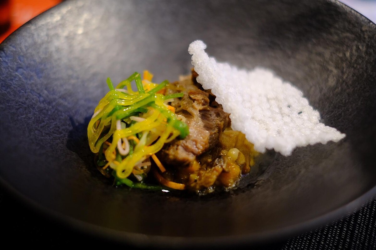 靈感來自辦桌海鮮羹。以千層烤甘藍包裹章魚與三款雞肉慕斯,搭配以沙茶、辣油、烏醋、九層塔融合的醬汁與烏醋晶球,濃郁中見細膩,小編實際品嘗覺得香氣層次相當豐富,彷彿把台灣夜市裡的羹湯轉譯成優雅的一道菜。