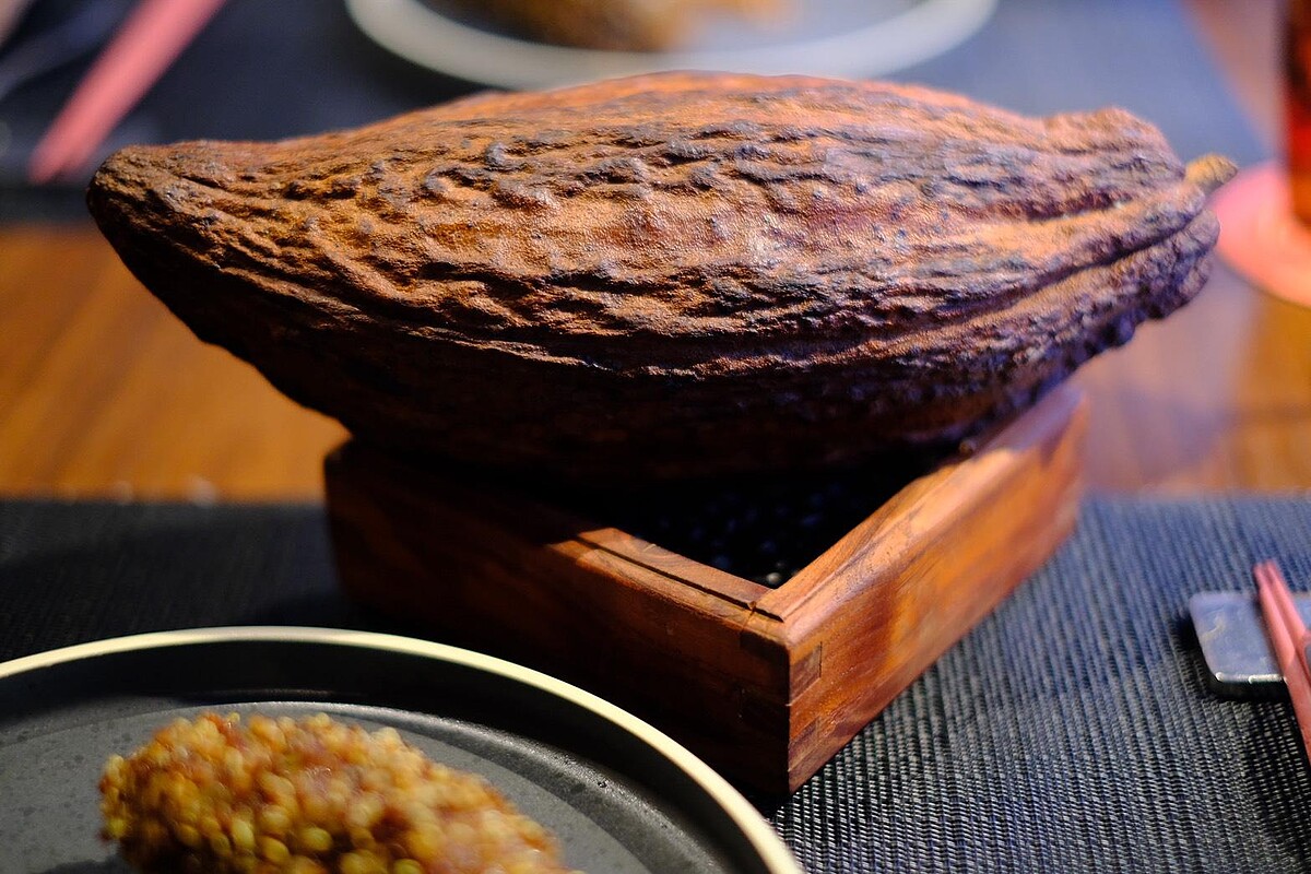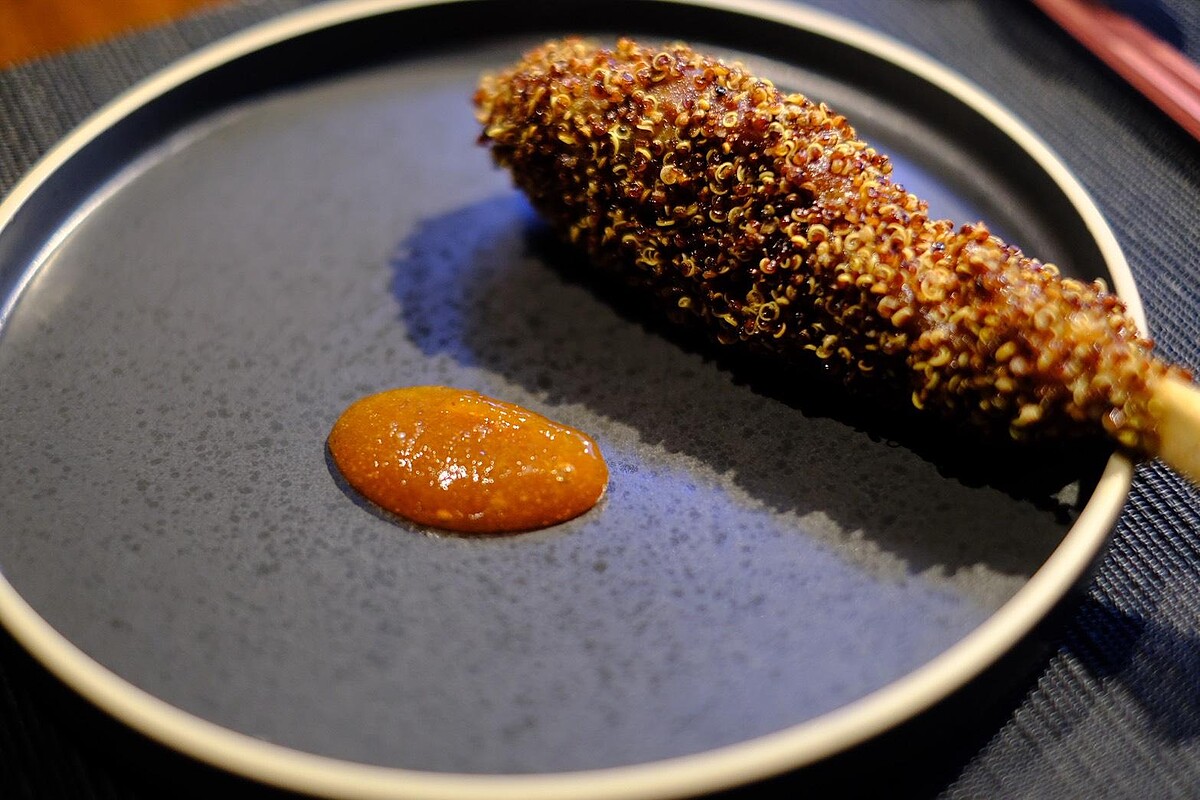 招牌中的招牌!源自家族年節菜蜜汁排骨,主廚使用宜蘭飼養、以穀物與可可餵養的豬隻,肉質油花細緻、香甜柔軟,搭配台灣金棗果醬、日本柴魚與法國雪莉醋熬製蜜汁,再裹上脆藜麥,鹹甜交織。小編認證這道菜肉質細嫩得令人驚豔,用刀輕輕一劃即可骨肉分離。