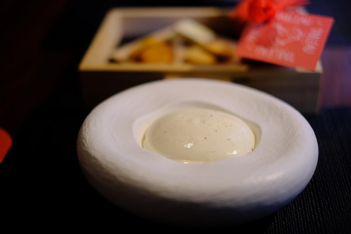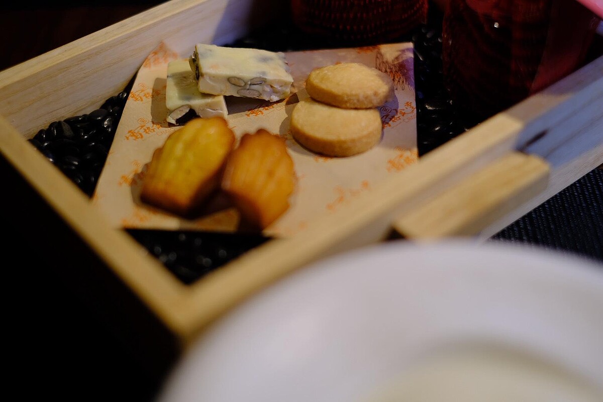 主廚用豆腐乳取代海鹽,與牛奶結合後意外產生牛奶糖般的香氣,鹹甜平衡。瑪德蓮與手工餅乾沾著豆腐乳奶霜吃,微鹹帶甜、風味驚喜,是結尾中最令人印象深刻的一幕。