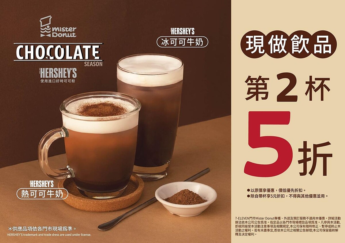 Mister Donut還同時推出「HERSHEY’S冰可可牛奶」與「HERSHEY'S熱可可牛奶」兩款飲品,將特製HERSHEY'S好時經典可可粉與香滑牛奶交織,調配出冬季療癒飲品,每杯售價75元,並享有第二件5折優惠。