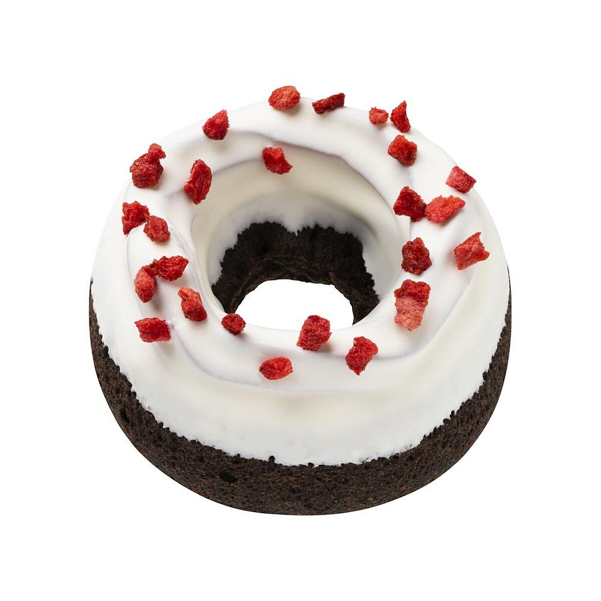另一款「HERSHEY’S覆盆莓可可多拿滋」(售價$69元)將可可多拿滋擠上酸甜的覆盆莓可可鮮奶油,並於外層沾裹上白可可沾醬,最後撒上乾燥草莓顆粒點綴,變身網美系甜甜圈!有網友形容就像是酸甜口感的覆盆莓配上濃郁布朗尼,層次超級豐富!