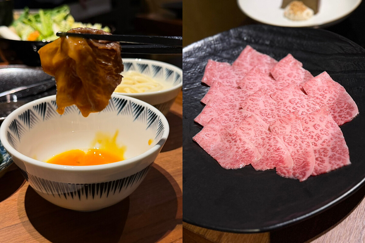 在鍋物選擇上,店內提供兩大派系,分別是日式涮涮鍋與關東風壽喜燒。涮涮鍋以羅臼昆布、鰹節高湯為基底,湯色清亮、香氣淡雅,讓肉的原味與油脂甘香完全展現。壽喜燒則走濃厚派,使用醬油、味醂、清酒與上白糖、蘋果熬製「割下」醬汁,煮開後將肉片、板豆腐、山藥與厚香菇逐一入鍋,香氣撲鼻。肉片再輕沾蛋液入口,鹹香與甜韻交錯,令人難以停箸。除了個人套餐,店內還推出雙人盛合涮涮鍋(3980元),以A5和牛紐約客、上選與日本和牛組成三重奏,近期供應的A5肉品包含宮崎牛、山形牛與神戶紅酒牛等,會依每日進貨狀況調整保持最佳鮮度。如果跟小編一樣重口味可以選擇壽喜燒,偏好清淡飲食風格則可以選涮涮鍋,都能品嚐到新鮮的肉質。
