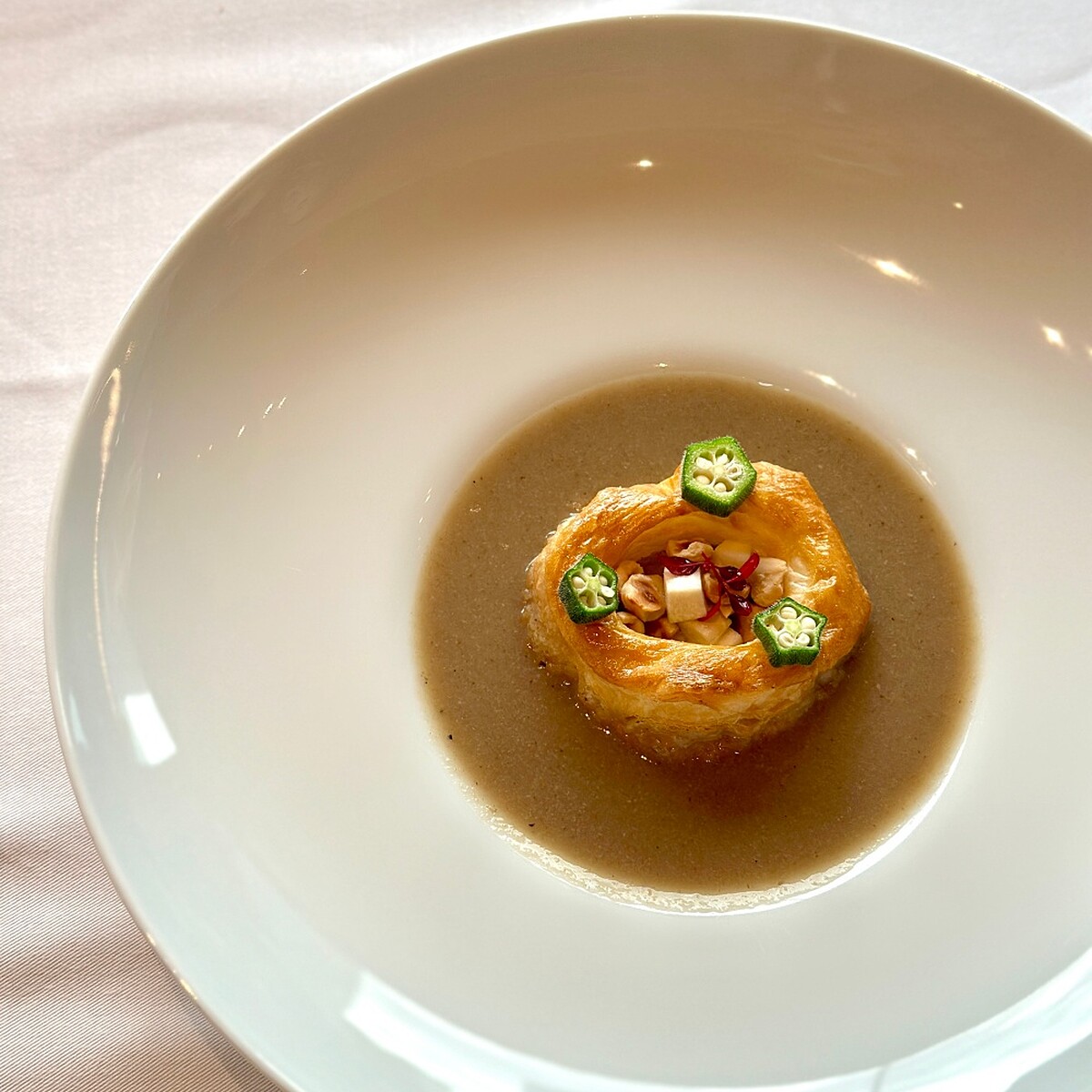 擺盤相當吸睛,中央鏤空螺旋酥餅以榛果與秋葵點綴,倒在周遭的湯汁以多種菇類慢火熬燉,並加入馬鈴薯提升稠度與綿滑口感,有著溫潤且濃郁香氣的口感,適合微涼氣溫來上一碗暖心又暖胃。