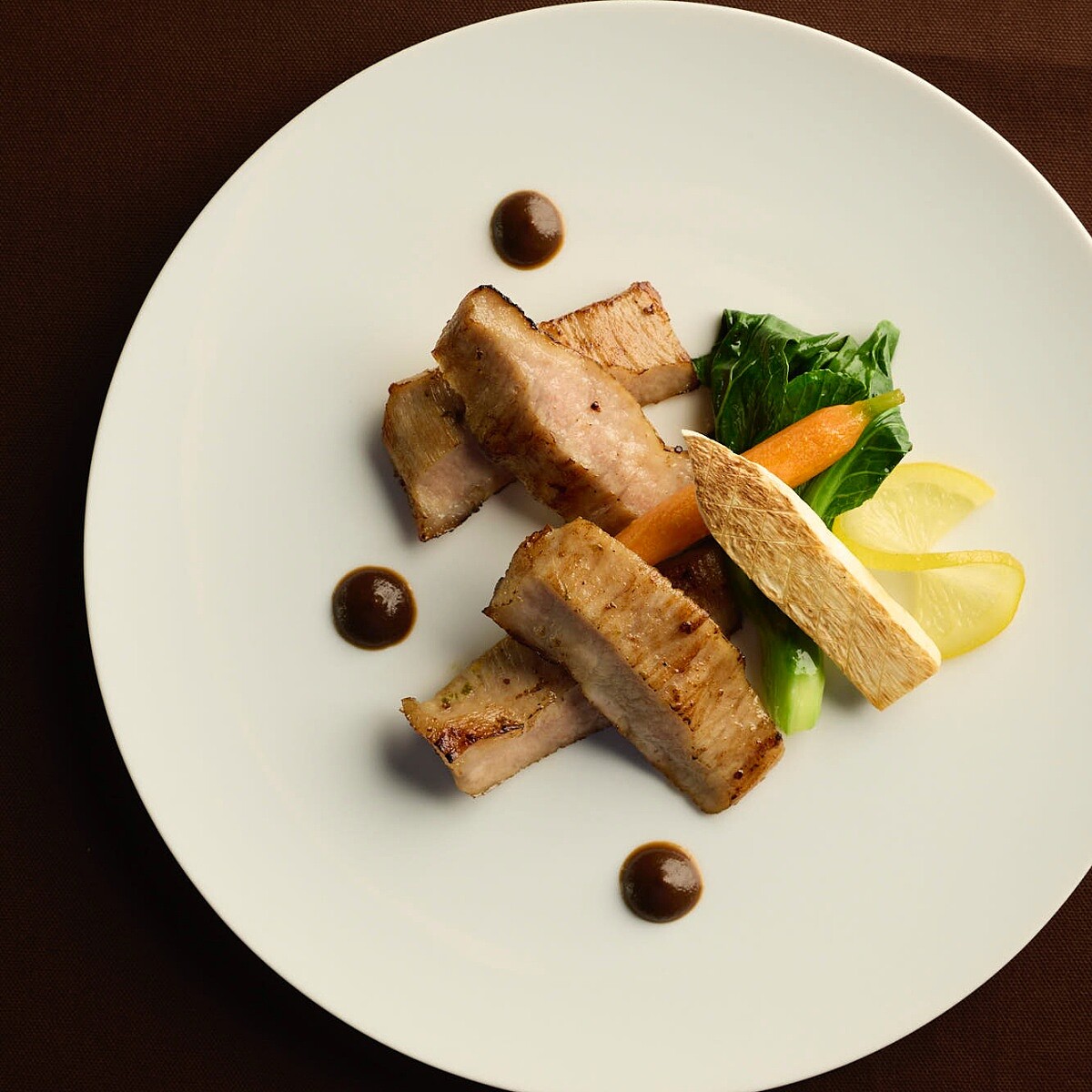 低溫舒肥後煎至金黃,佐以黑蒜、炸蒜仁、洋蔥與白蘿蔔熬製的手工醬汁,整體口感既酸甜又濃郁,是精緻法式手法與在地食材的絕佳融合。