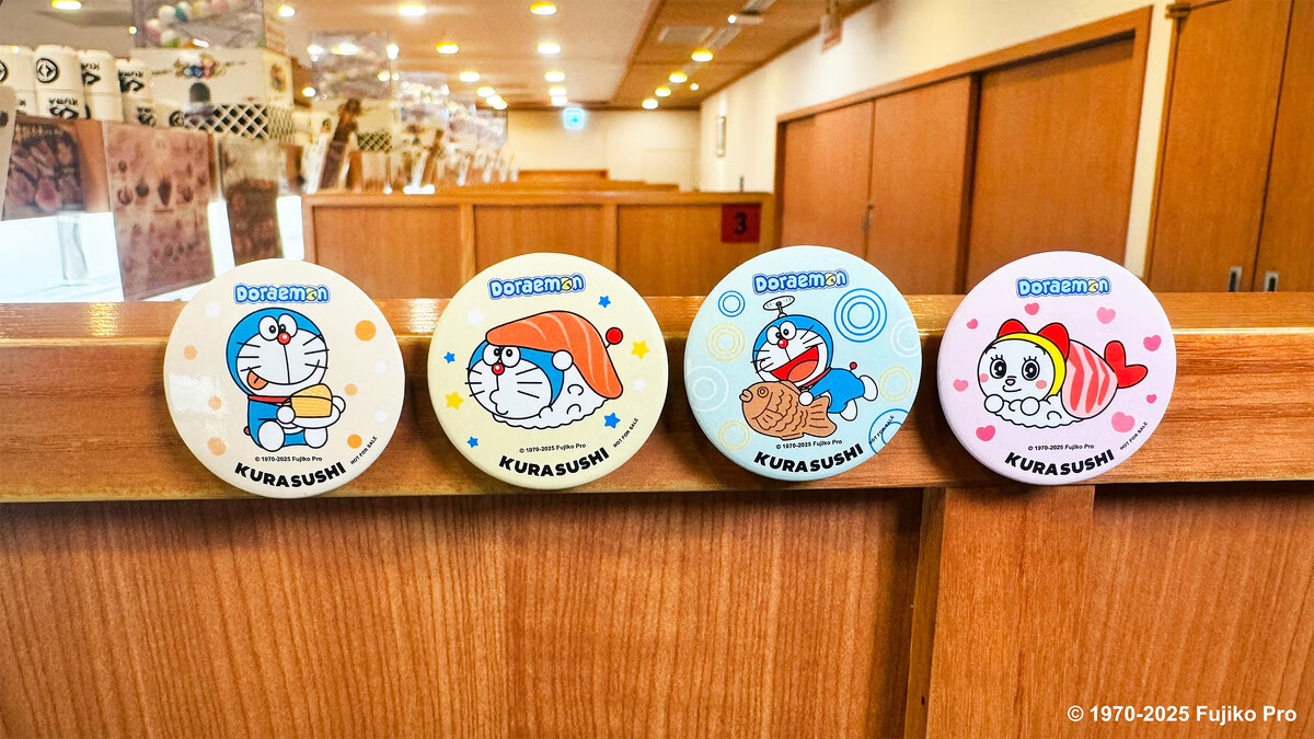 4款胸章設計各具特色,有哆啦A夢與哆啦美化身鮭魚、鮮蝦壽司的可愛造型,也有手拿藏壽司人氣甜點「鯛魚燒」與「千層蛋糕」的歡樂模樣,每一款都充滿療癒氛圍。