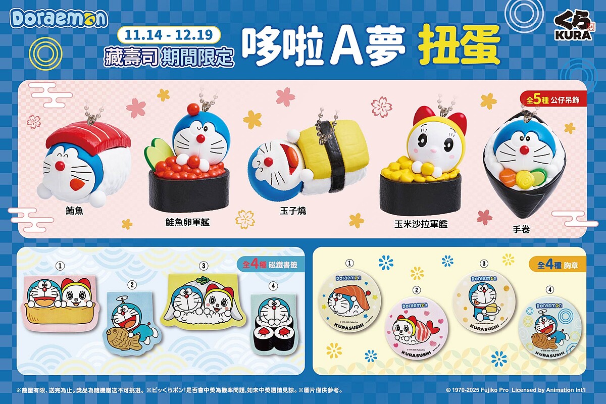 近期在Threads上瘋狂洗版的「藏壽司×哆啦A夢」聯名活動,可說是2025年底最受期待的餐飲聯名!從11/14起至12/19推出限量聯名活動,而最受矚目為本次聯名扭蛋,共有13款全部設計成與壽司或甜點結合的限定造型,只在全台藏壽司店鋪的扭蛋機中現身。