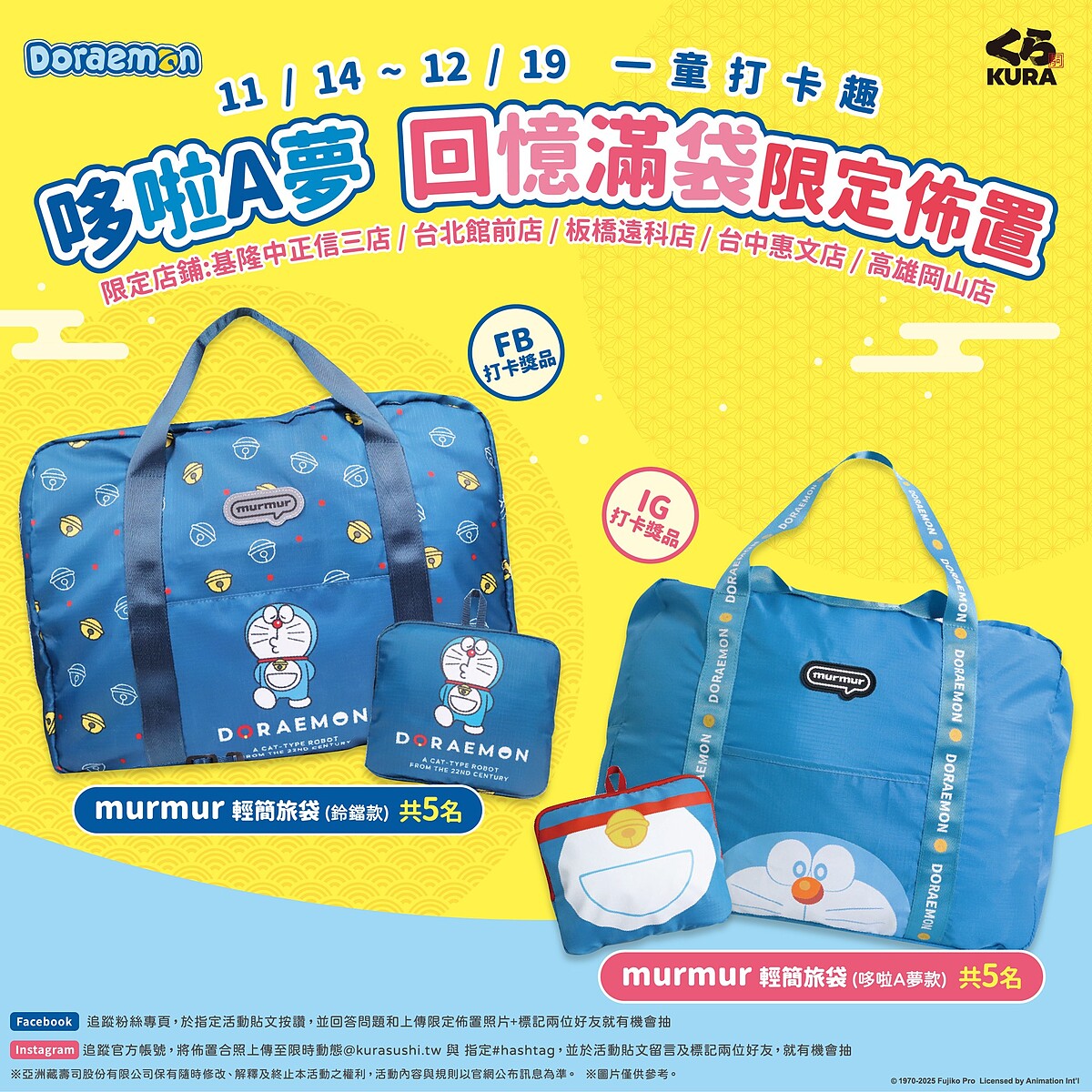 活動期間在5間主題門市拍照打卡,追蹤藏壽司官方FB或IG,在活動貼文按讚、上傳佈置照片並留言寫下為什麼喜歡哆啦A夢+標記2位好友,就有機會抽中超可愛的「murmur輕簡旅袋」。