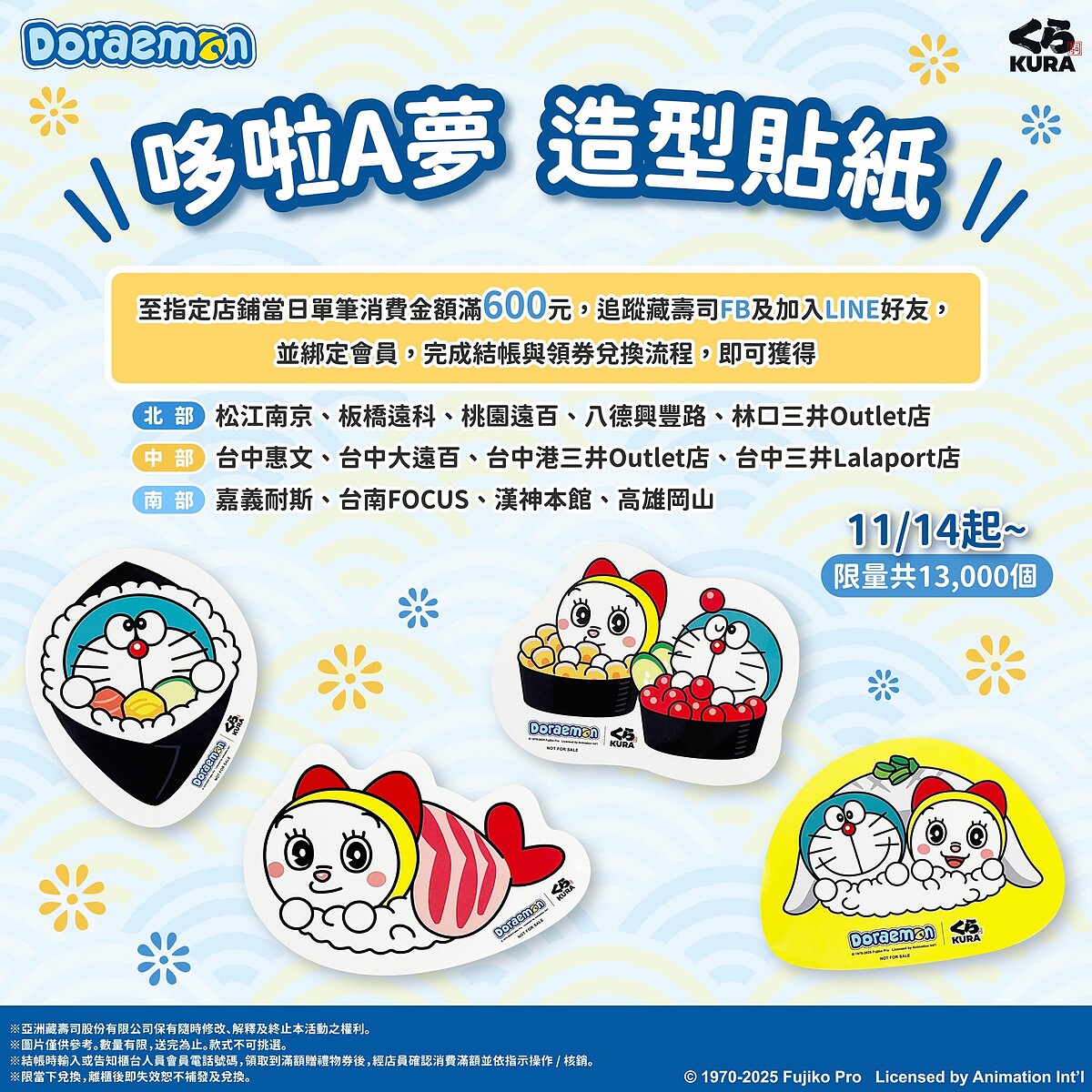 藏壽司也推出限店滿額贈活動,於全台13間指定門市消費滿600元,並追蹤藏壽司官方Facebook,即可獲得哆啦A夢「造型貼紙」1張。貼紙共4款,全台限量13,000個,送完為止。參與滿額贈的門市包括松江南京、板橋遠科、桃園遠百、八德興豐路、林口三井Outlet店、台中惠文、台中大遠百、台中港三井Outlet店、台中三井Lalaport店、嘉義耐斯、台南FOCUS、漢神本館、高雄岡山。