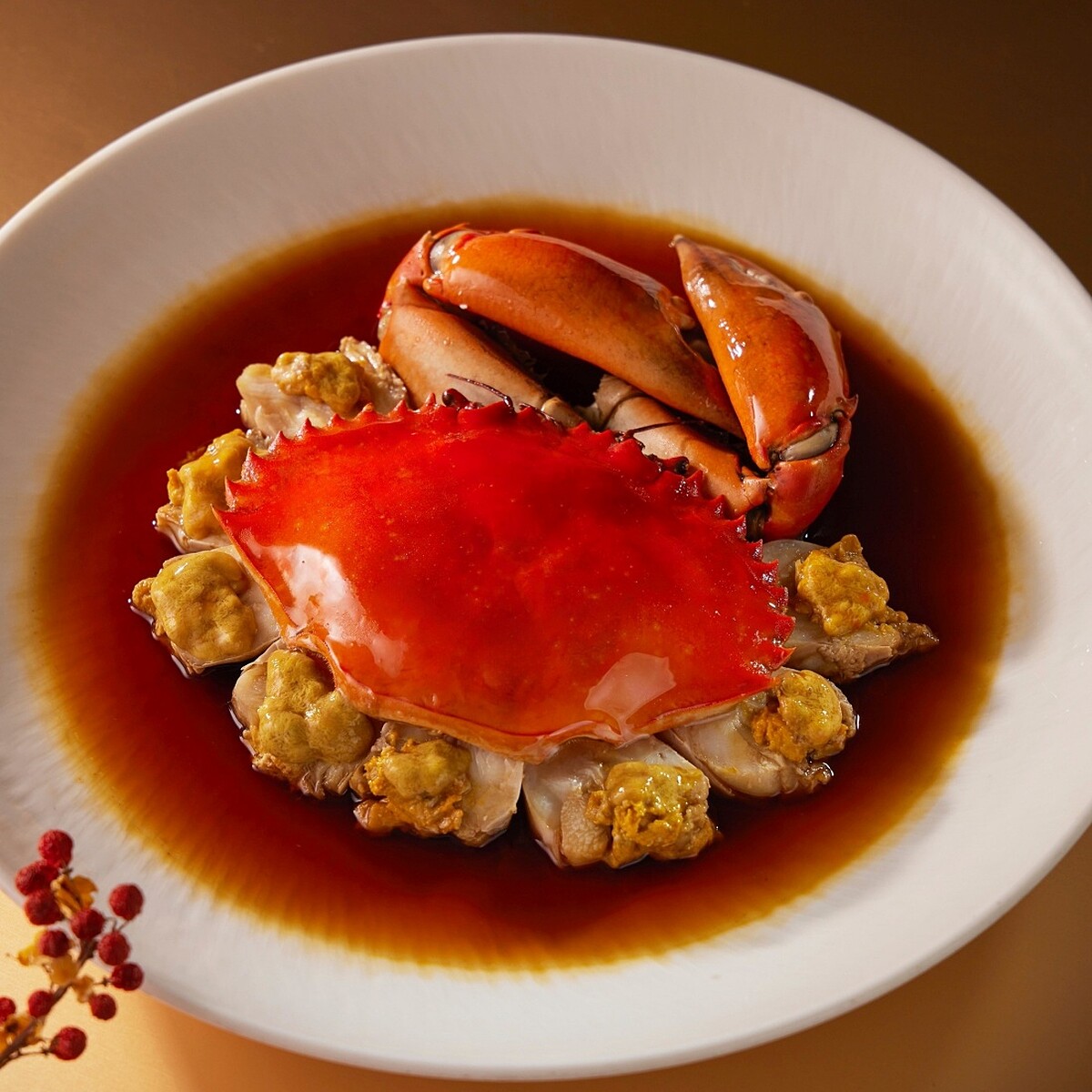 別於將生蟹以酒浸漬生食的「生醃」,中國江浙特色的「熟醉」料理,是將螃蟹蒸熟後才放入調理過的醉汁,以酒去腥並帶出蟹肉鮮甜。嚴選當季處女蟳蒸至鮮嫩飽滿,濕潤濃稠的蟹膏透出金黃晶亮色澤,浸入花雕、白蘭地、高粱特調醬汁泡約3小時,其酒香與蟹膏完美交融,甘香微醉滋味叫人難以忘懷。