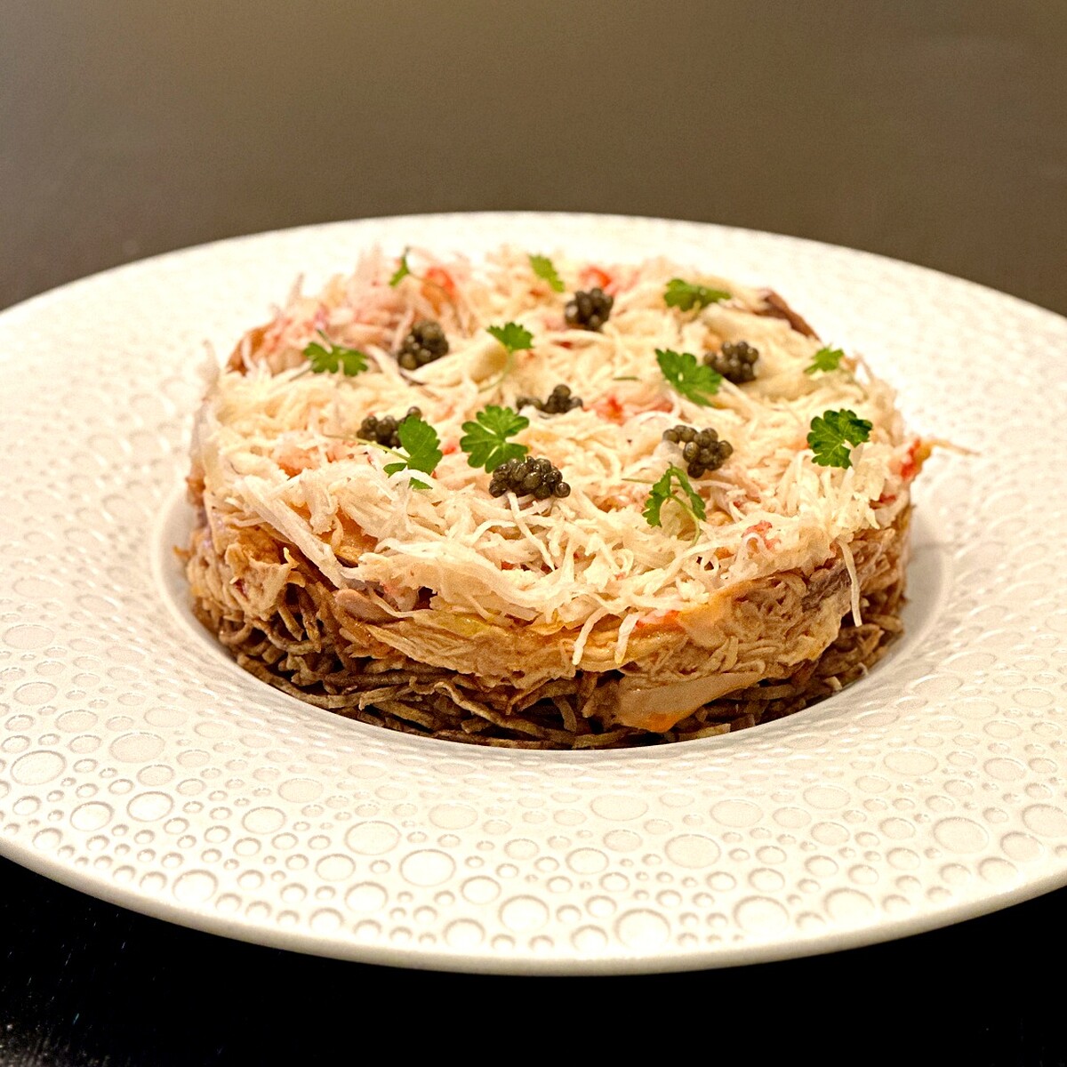 酥炸至金黃的芋頭絲、Q彈雞腿肉、鮮嫩松葉蟹肉層層堆疊,上桌前點綴魚子醬、食用花,並佐以紅油與辣油調製的醬汁。一次能品嚐酥脆、彈嫩與鮮甜的完美交織,紅油與煳辣油有著奔放香氣,卻不過度搶過食材本身,呈現出創新與經典的完美平衡。