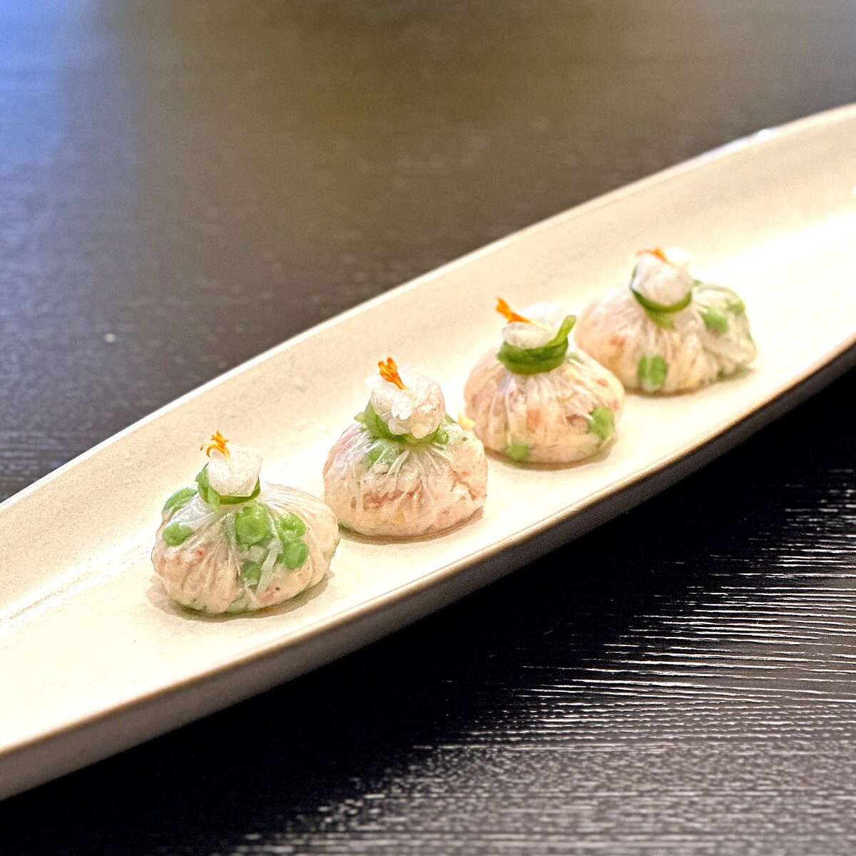 把松葉蟹肉蒸熟後取出,搭配豆眼、爽脆筍丁,並僅以少許鹽巴提鮮,保留食材的原味鮮香。接著把餡料包入越南春捲皮、捏成石榴狀並以水蓮菜綁緊,精緻外型令人傾心。