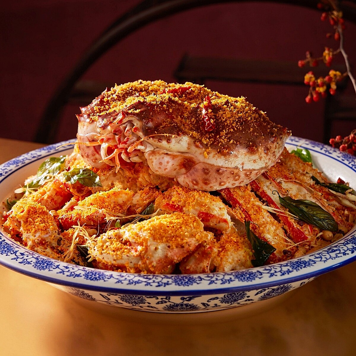 「金蟹宴」最大亮點!選用重達3公斤帝王蟹,改良自粵菜「避風塘」料理手法,並結合川味佐料,先將金黃蒜酥、成都新一代朝天椒辣椒粉炒成金紅色料底,帝王蟹以高溫加入脆漿炸至飽滿7分熟,再入鍋與花生、金紅色料底小火拌炒,使辛香蒜辣緊緊裹附每一絲蟹肉,出鍋後再撒上香茅碎、九層塔提香,多層次風味令人難以停下餐具。