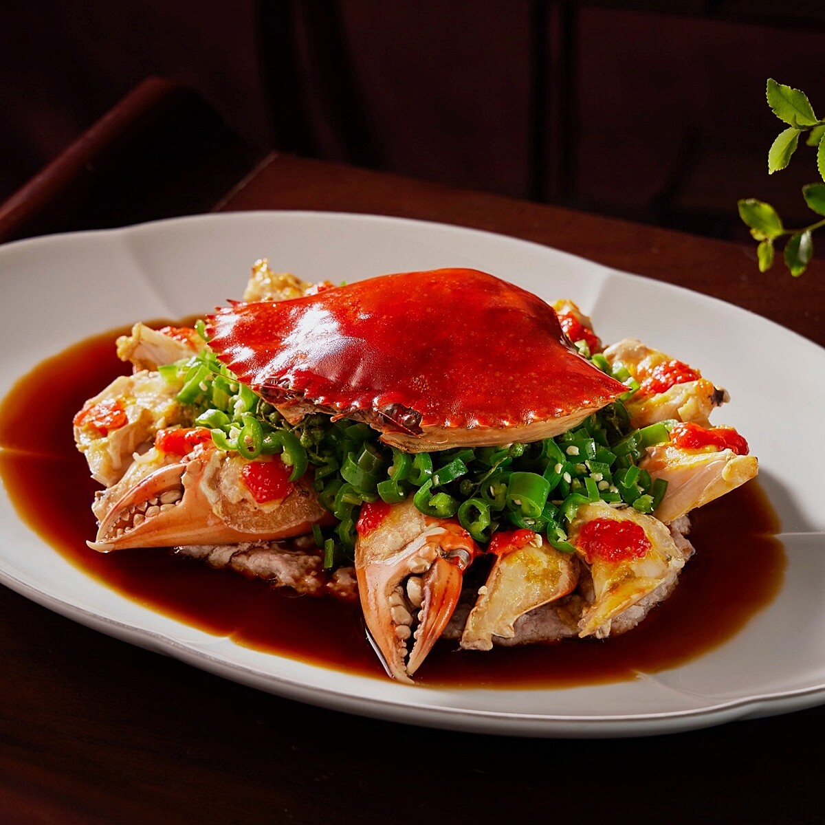 將沙母蟹拆解、取其肥美的蟹肉,鋪在豬肉泥基底上,頂層鋪以濃郁濕潤的蟹膏並以大火蒸製,使蟹汁精華完美滲入肉餅,出爐後擺上滿滿的青辣藤椒,以及淋上特製魚露椒汁,結合辛香與鮮味、清韻微麻,實為味蕾的一場華麗冒險。