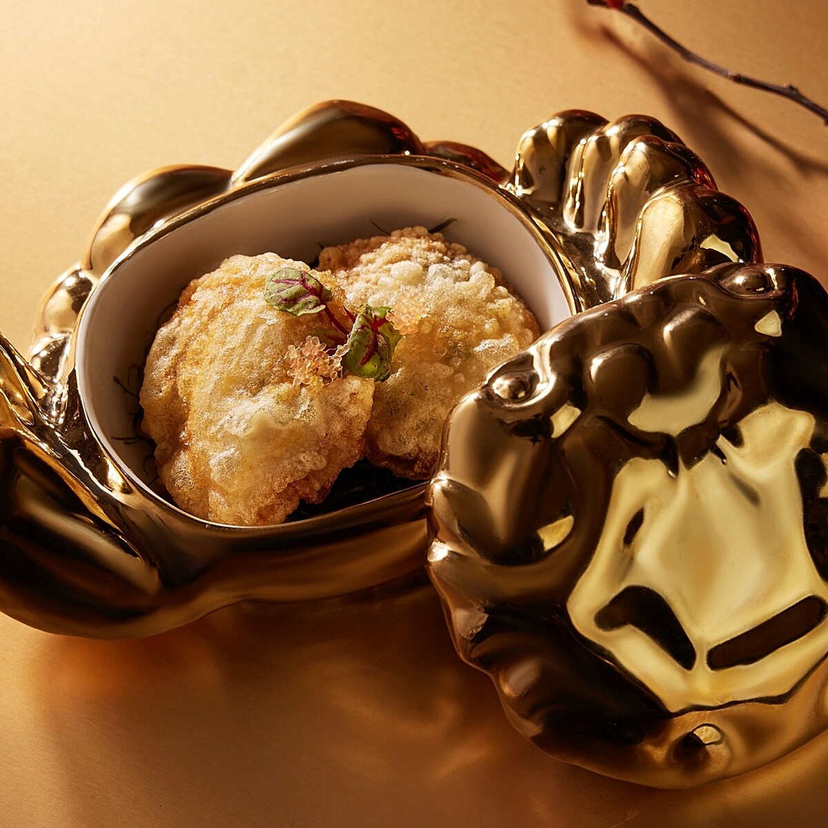 上桌就使人眼睛一亮!以全新「金蟹食器」盛盤,將薄切酥炸的琵琶肉包裹蝦仁漿、鮮拆蟹鉗肉與韭菜餡、藤椒與香菜提鮮,外層裹上蛋白漿炸至金黃。蟹盒入口酥皮薄透、咬開瞬間蟹汁伴隨熱氣滲出、藤椒清香隨之在口腔綻放。