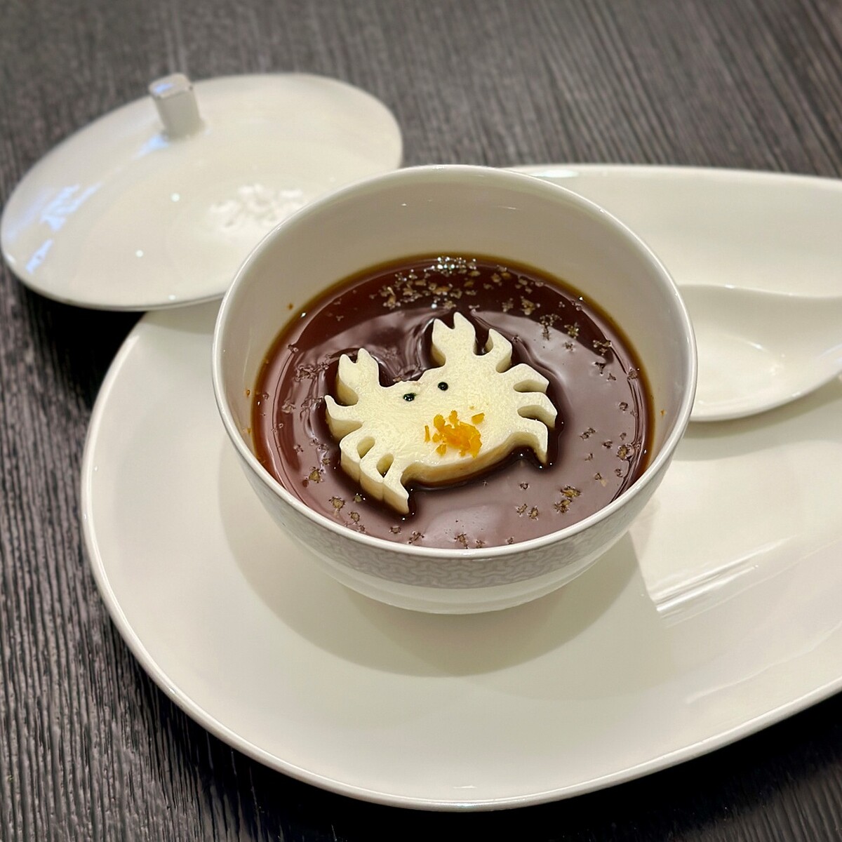 飯後甜點絕佳推薦!以老紅糖慢火熬煮製成糖漿並將新鮮橘皮切末放入,讓橘皮清香融入老紅糖漿的甜味,鋪於頂層的「螃蟹模型奶凍」則是以糯米山藥、牛奶和鮮奶油攪拌後塑形而成,山藥與牛奶結合的軟糯香氣配上老紅糖水的絲滑甜口,同時有暖胃祛寒、緩解蟹的寒性之用。